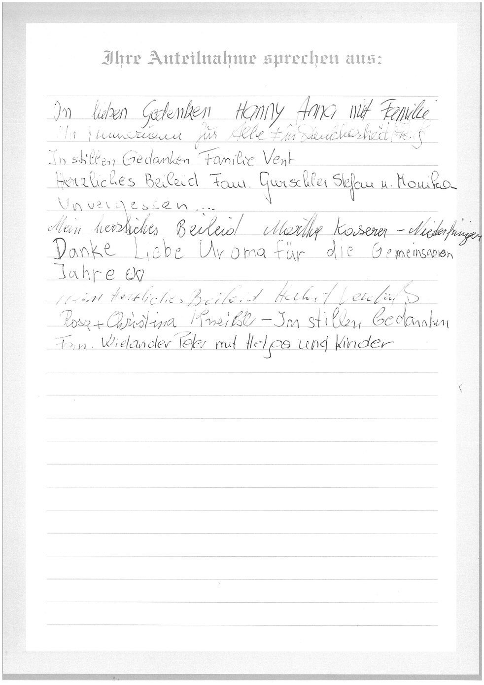deine Enkel Werner mit Andrea, Stefan mit Magdalena, Christian, Alexander, Tobias, Andreas, Simon mit Simone, Thomas mit Silvia, Katrin mit Hannes, Stefanie mit Manuel, Michael mit Andrea, Daniel mit Siegi, Patric mit Jenny, Manuel und Anna Maria