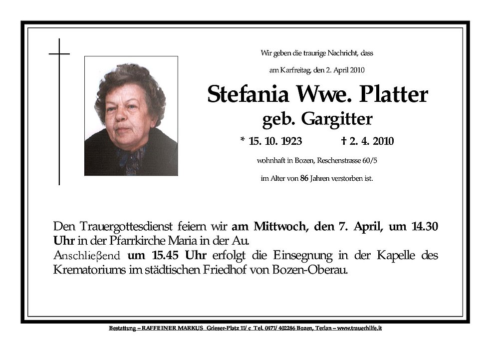 Den Trauergottesdienst feiern wir am Mittwoch, dem 7. April, um 14.30 Uhr in der Pfarrkirche Maria in der Au; anschlieβend um 15.45 Uhr erfolgt die Einsegnung in der Kapelle des Krematoriums im städtischen Friedhof von Bozen-Oberau.