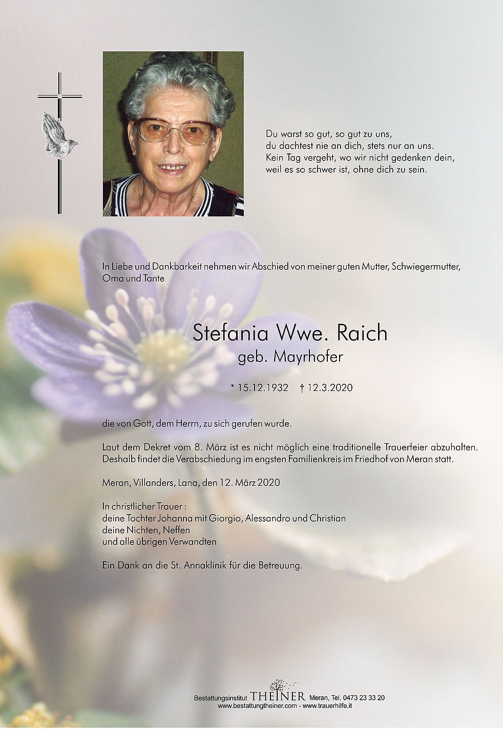Laut dem Dekret vom 8. März ist es nicht möglich eine traditionelle Trauerfeier abzuhalten. Deshalb findet die Verabschiedung im engsten Familienkreis im Friedhof von Meran statt.