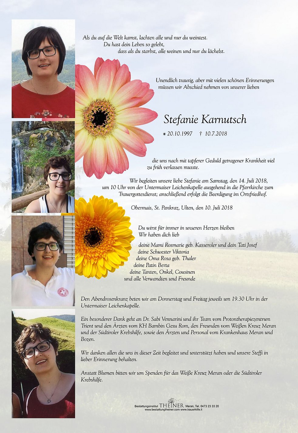 Wir begleiten unsere liebe Stefanie am Samstag, den 14. Juli 2018, um 10 Uhr von der Untermaiser Leichenkapelle ausgehend in die Pfarrkirche zum Trauergottesdienst; anschließend erfolgt die Beerdigung im Ortsfriedhof.