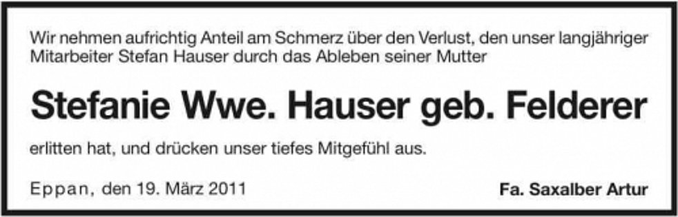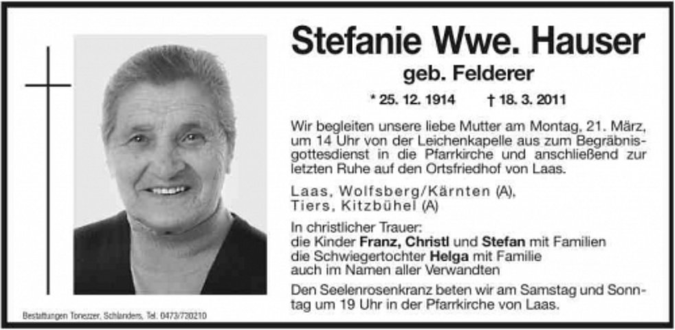 Wir begleiten unsere liebe Mutter am Montag, 21. März, um 14 Uhr von der Leichenkapelle aus zum Begräbnisgottesdienst in die Pfarrkirche und anschließend zur letzten Ruhe auf den Ortsfriedhof von Laas.