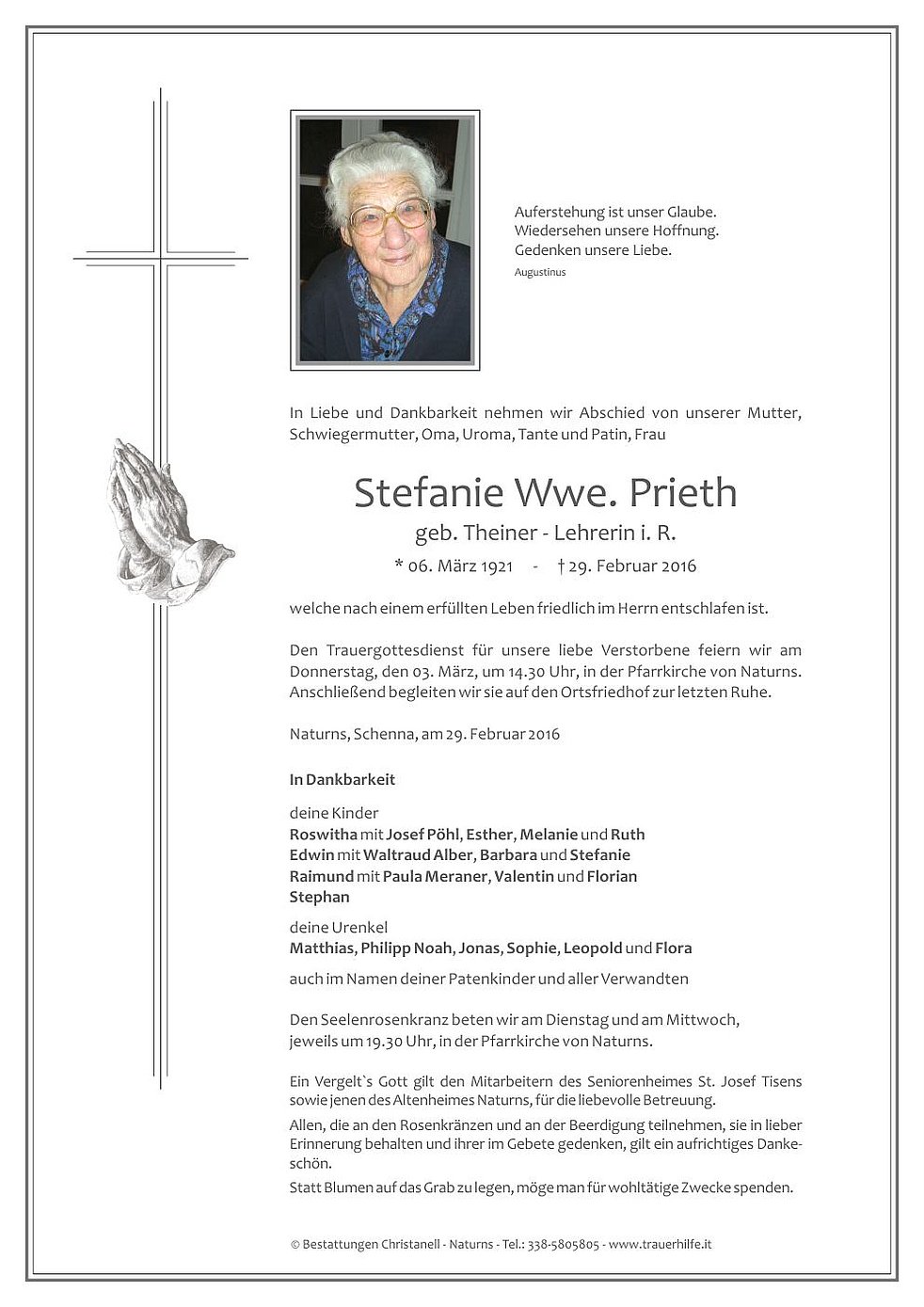 Den Trauergottesdienst für unsere liebe Verstorbene feiern wir am Donnerstag, den 03. März, um 14.30 Uhr, in der Pfarrkirche von Naturns. Anschließend begleiten wir sie auf den Ortsfriedhof zur letzten Ruhe.
