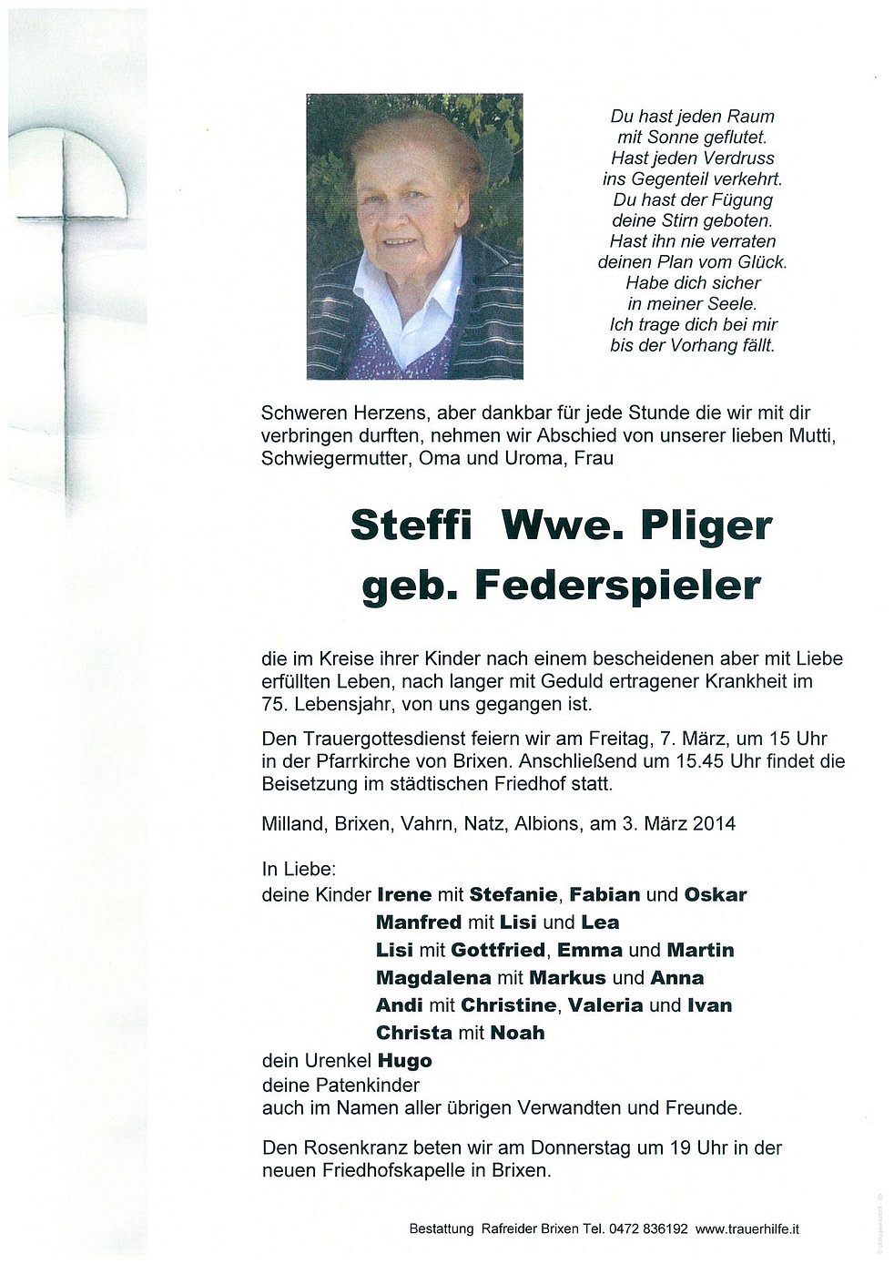 Den Trauergottesdienst feiern wir am Freitag, 7. März, um 15 Uhr in der Pfarrkirche von Brixen. Anschließend um 15.45 Uhr findet die Beisetzung im städtischen Friedhof statt.