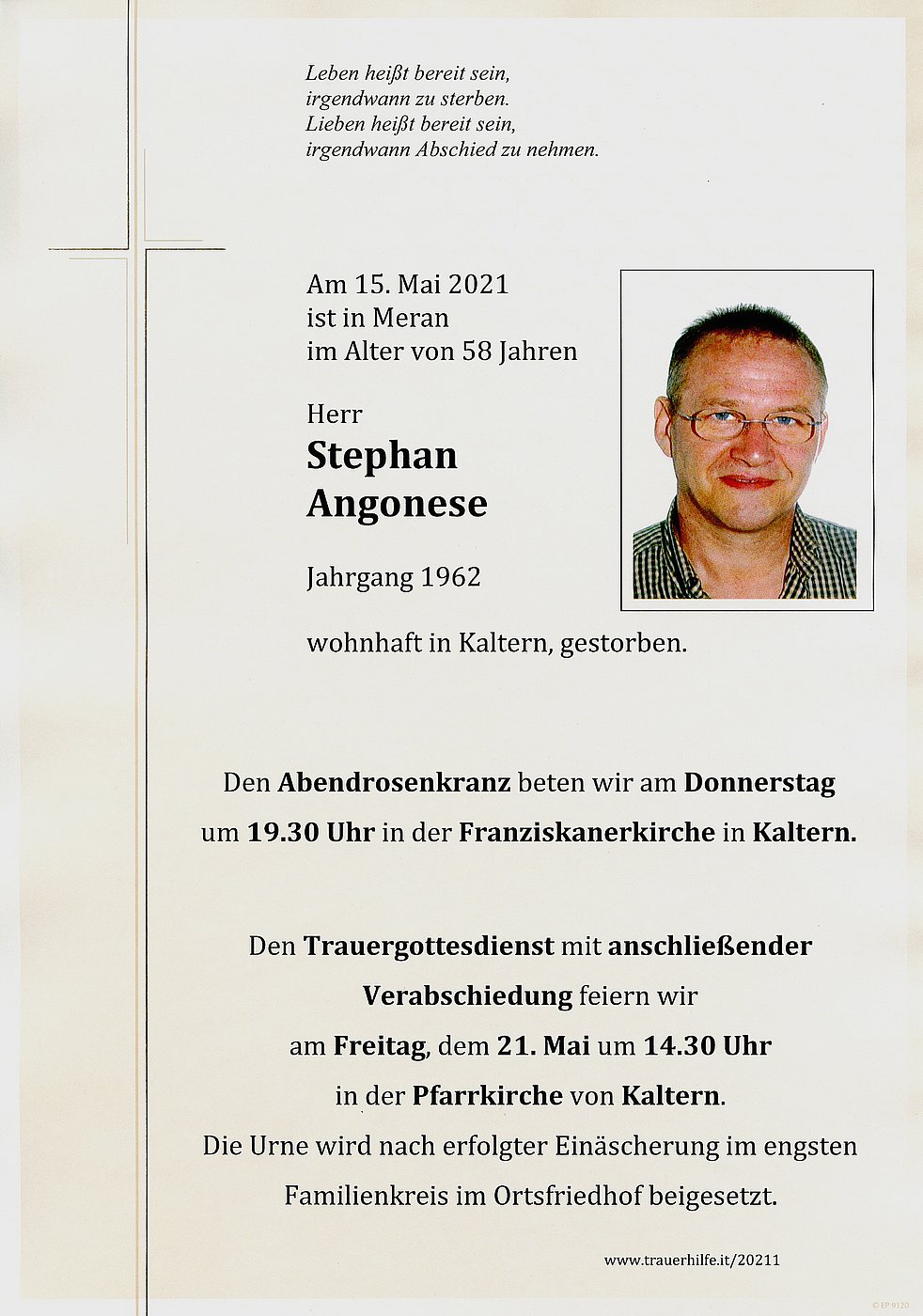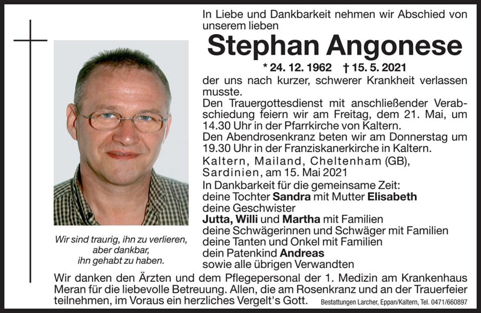 Den Trauergottesdienst mit anschließender Verabschiedung feiern wir am Freitag, dem 21. Mai um 14.30 Uhr in der Pfarrkirche von Kaltern.