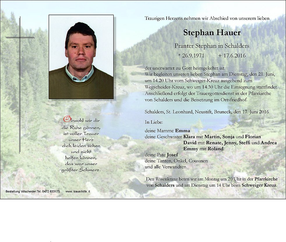 um 14.20 Uhr vom Schweiger-Kreuz ausgehend zum Wegscheider-Kreuz, wo um 14.30 Uhr die Einsegnung stattfindet. Anschließend erfolgt der Trauergottesdienst in der Pfarrkirche von Schalders und die Beisetzung im Ortsfriedhof.