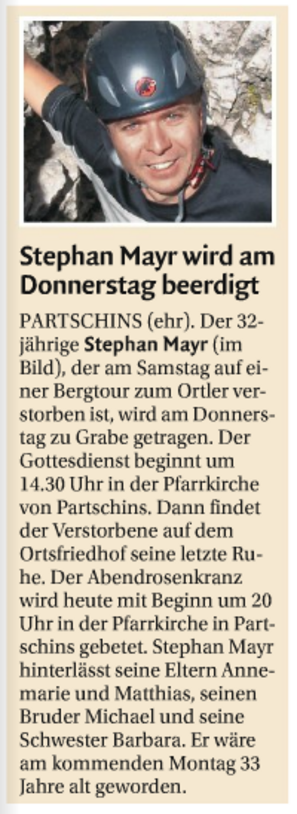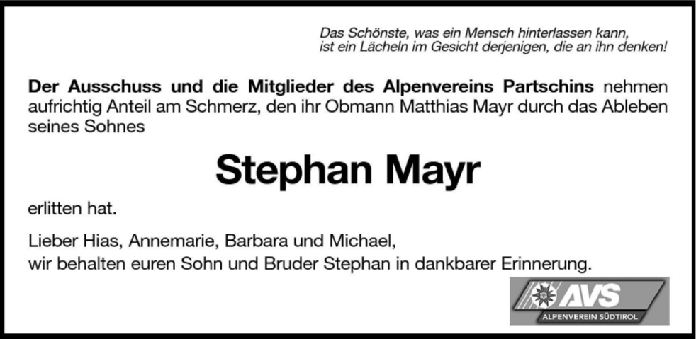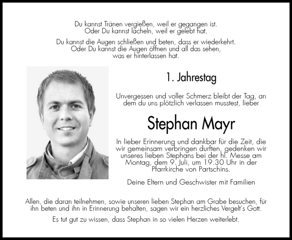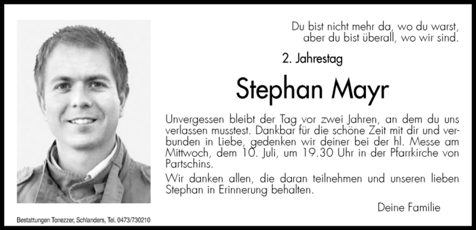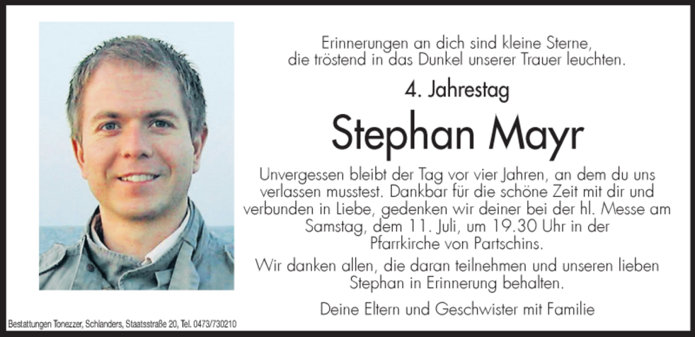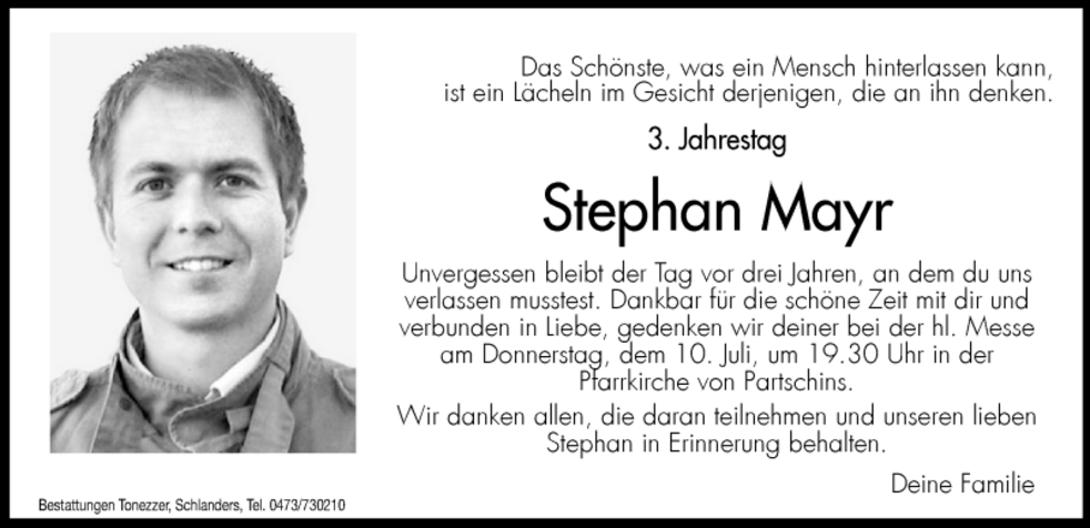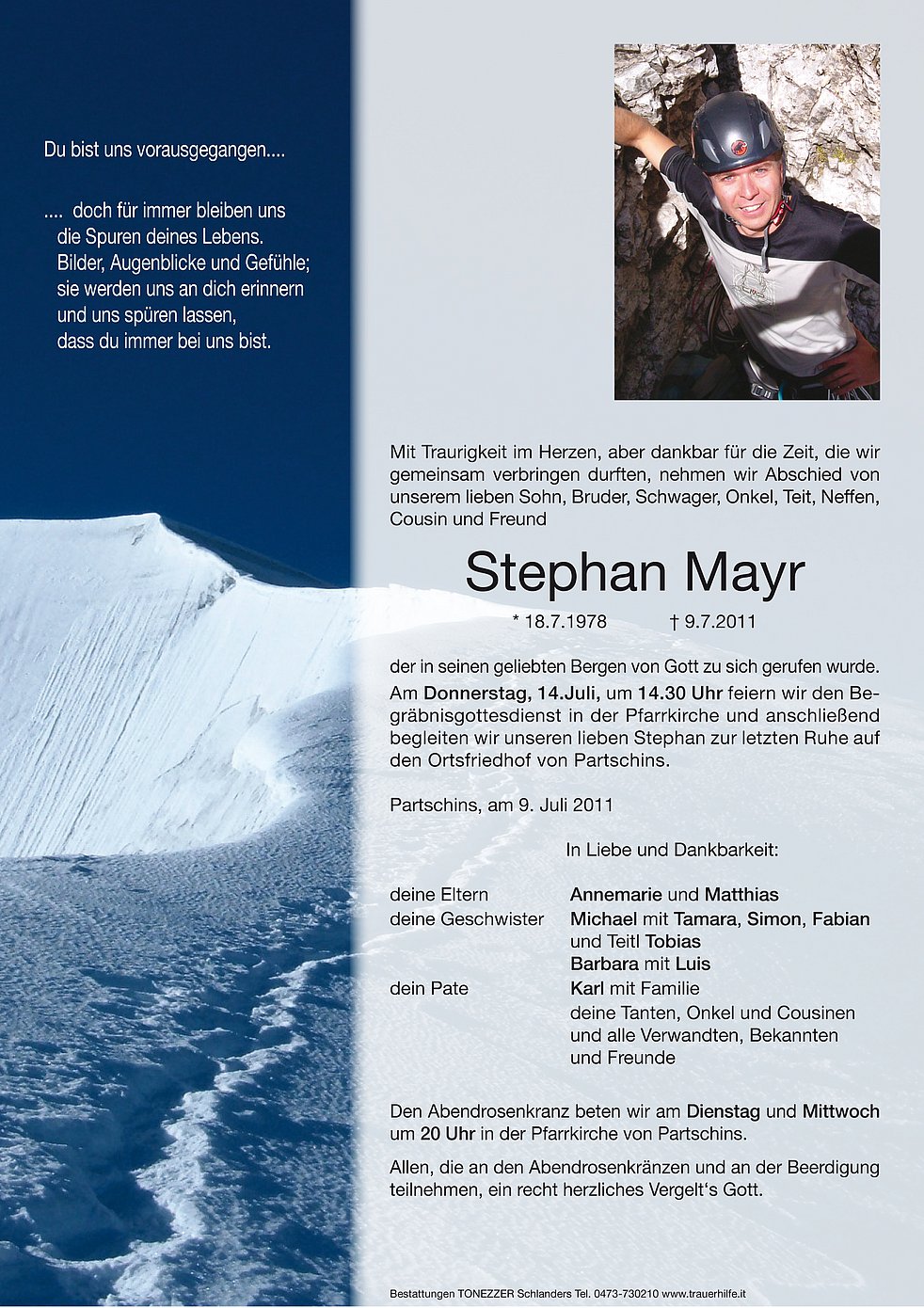 Am Donnerstag, 14.Juli, um 14.30 Uhr feiern wir den Begräbnisgottesdienst in der Pfarrkirche und anschließend begleiten wir unseren lieben Stephan zur letzten Ruhe auf den Ortsfriedhof von Partschins.