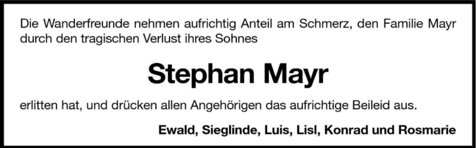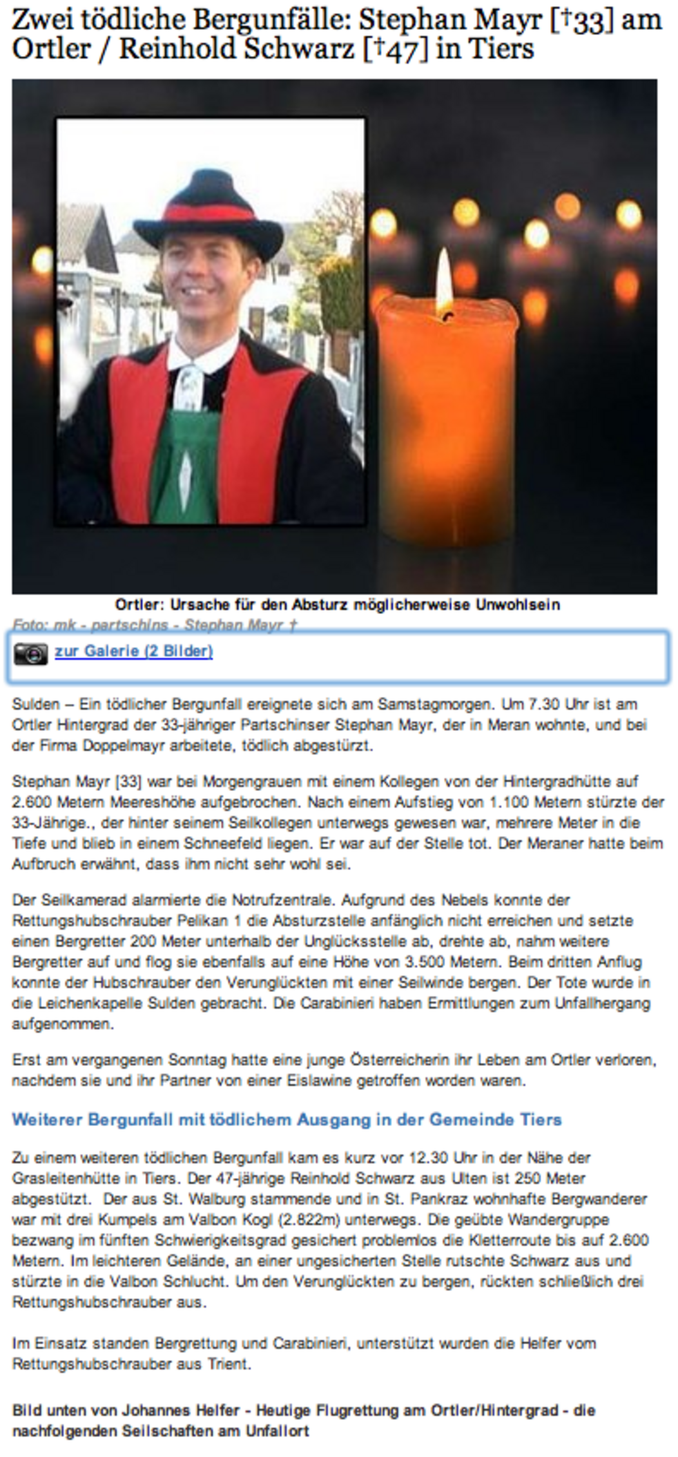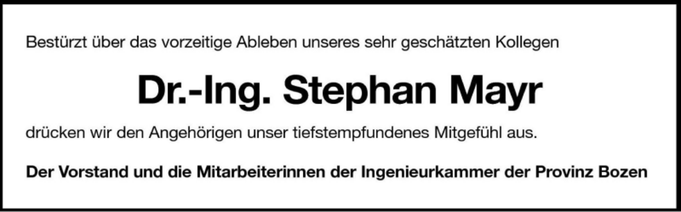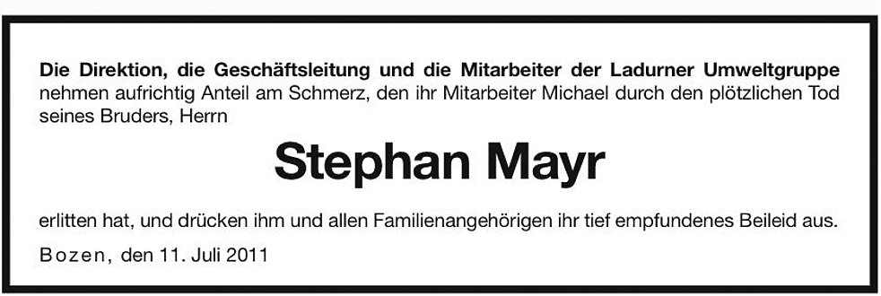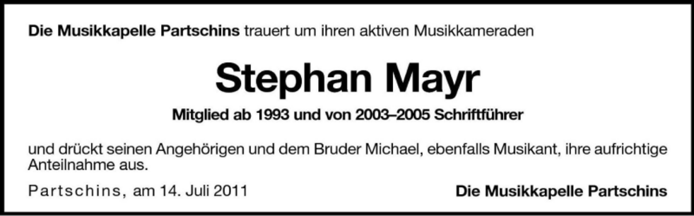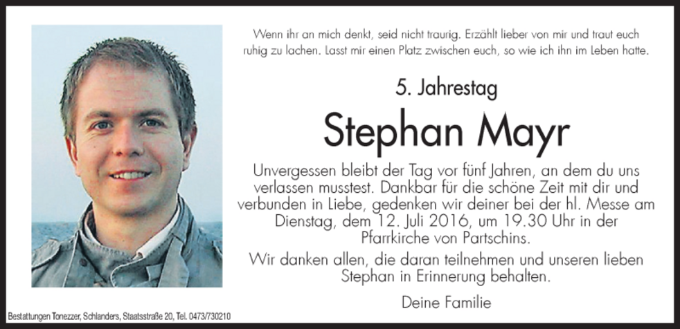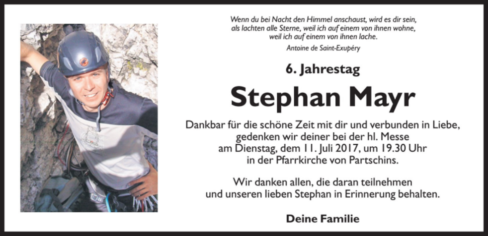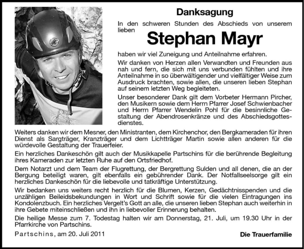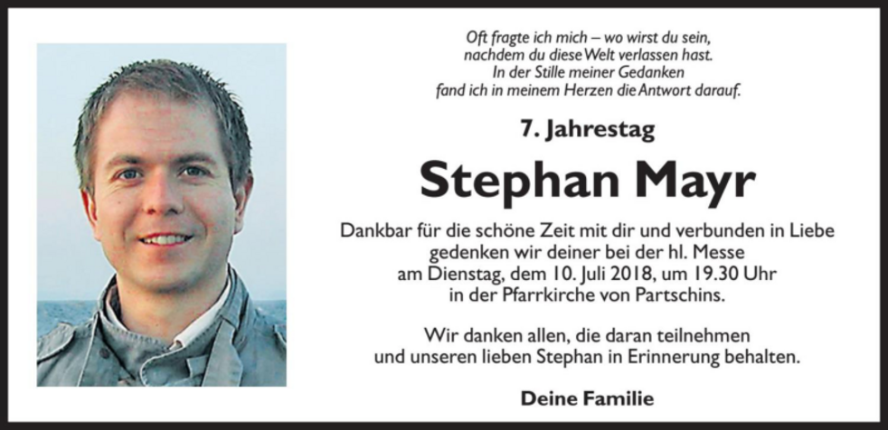 Am Donnerstag, 14.Juli, um 14.30 Uhr feiern wir den Begräbnisgottesdienst in der Pfarrkirche und anschließend begleiten wir unseren lieben Stephan zur letzten Ruhe auf den Ortsfriedhof von Partschins.