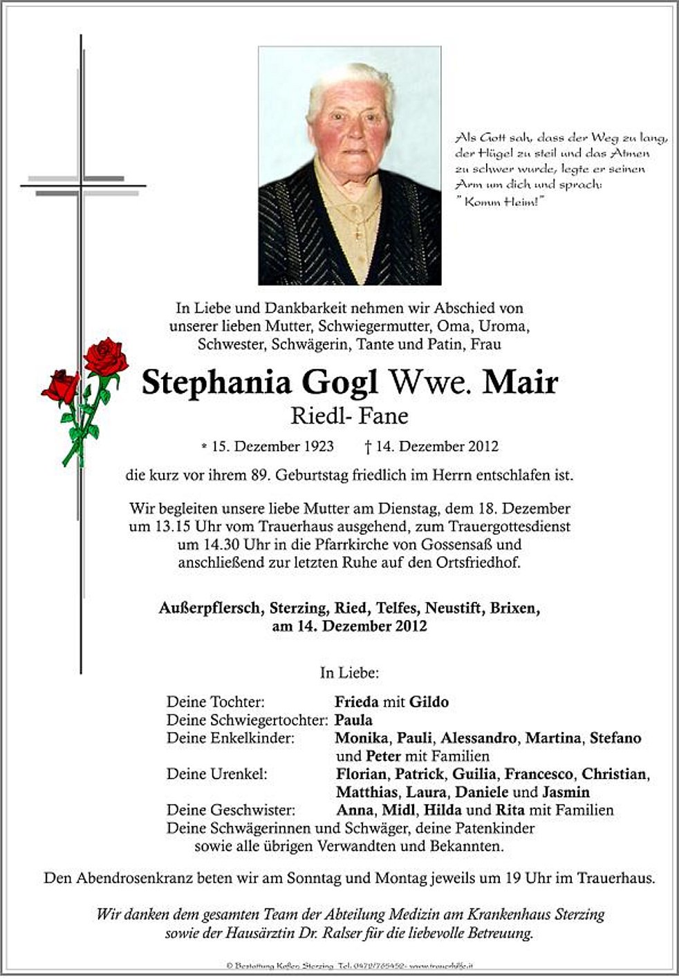 Wir begleiten unsere liebe Mutter am Dienstag, dem 18. Dezember um 13.15 Uhr