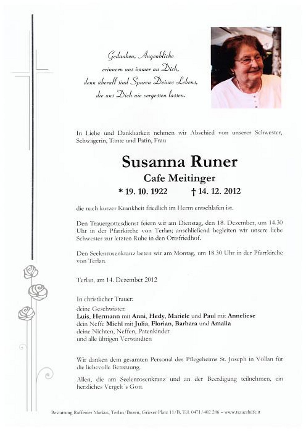 Den Trauergottesdienst feiern wir am Dienstag, den 18. Dezember, um 14.30 Uhr in der Pfarrkirche von Terlan; anschließend begleiten wir unsere liebe Schwester zur letzten Ruhe in den Ortsfriedhof.