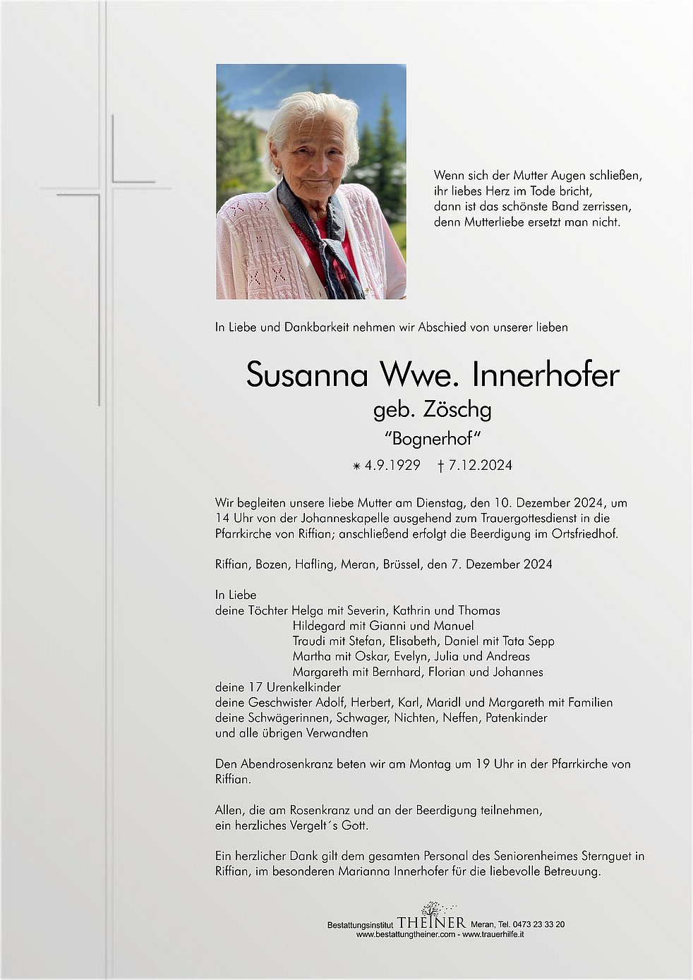 Wir begleiten unsere liebe Mutter am Dienstag, den 10. Dezember 2024, um 14 Uhr von der Johanneskapelle ausgehend zum Trauergottesdienst in die Pfarrkirche von Riffian; anschließend erfolgt die Beerdigung im Ortsfriedhof.