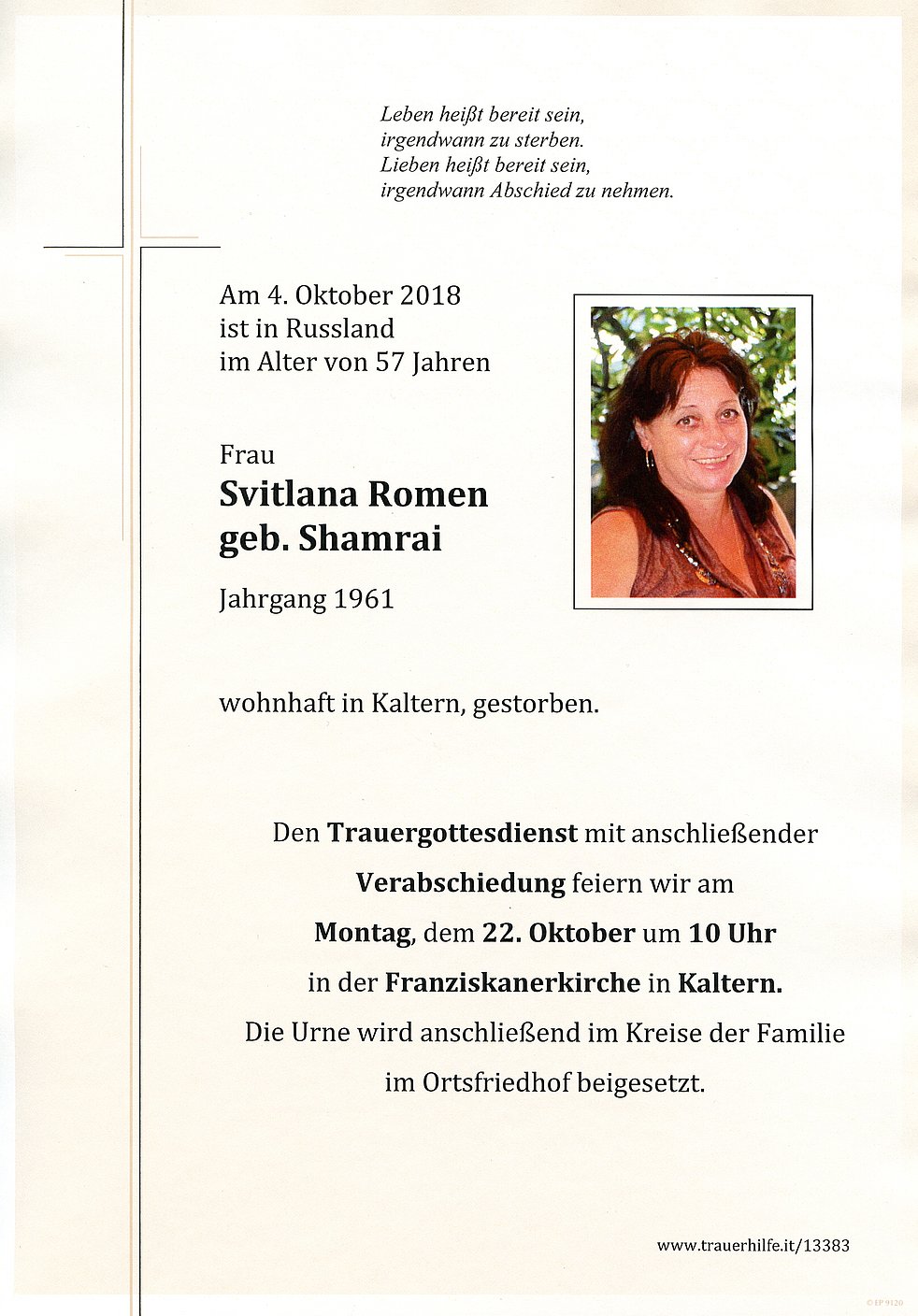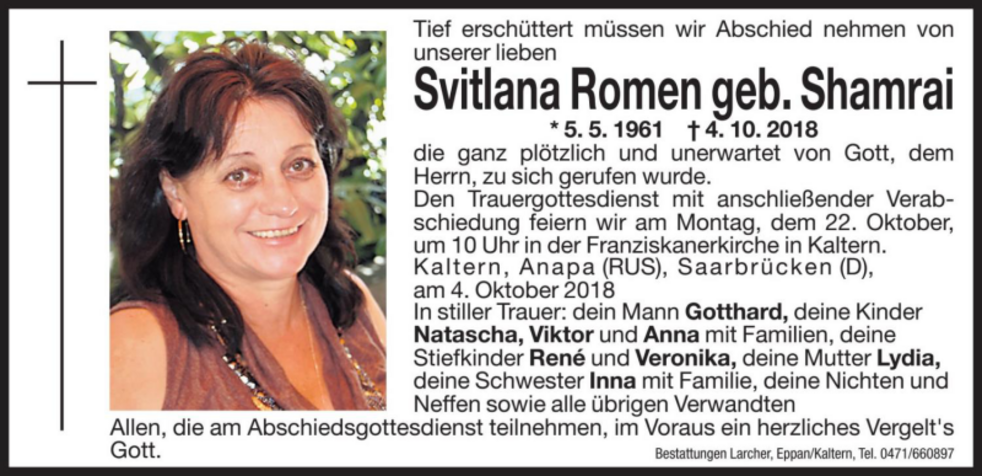 Den Trauergottesdienst mit anschließender Verabschiedung feiern wir am Montag, dem 22. Oktober um 10 Uhr in der Franziskanerkirche in Kaltern.