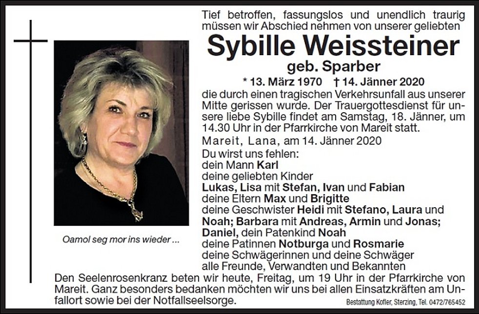 Der Trauergottesdienst für unsere liebe Sybille findet am Samstag, 18. Jänner, um 14.30 Uhr in der Pfarrkirche von Mareit statt. Anschließend begleiten wir sie zur letzten Ruhe auf den Ortsfriedhof.