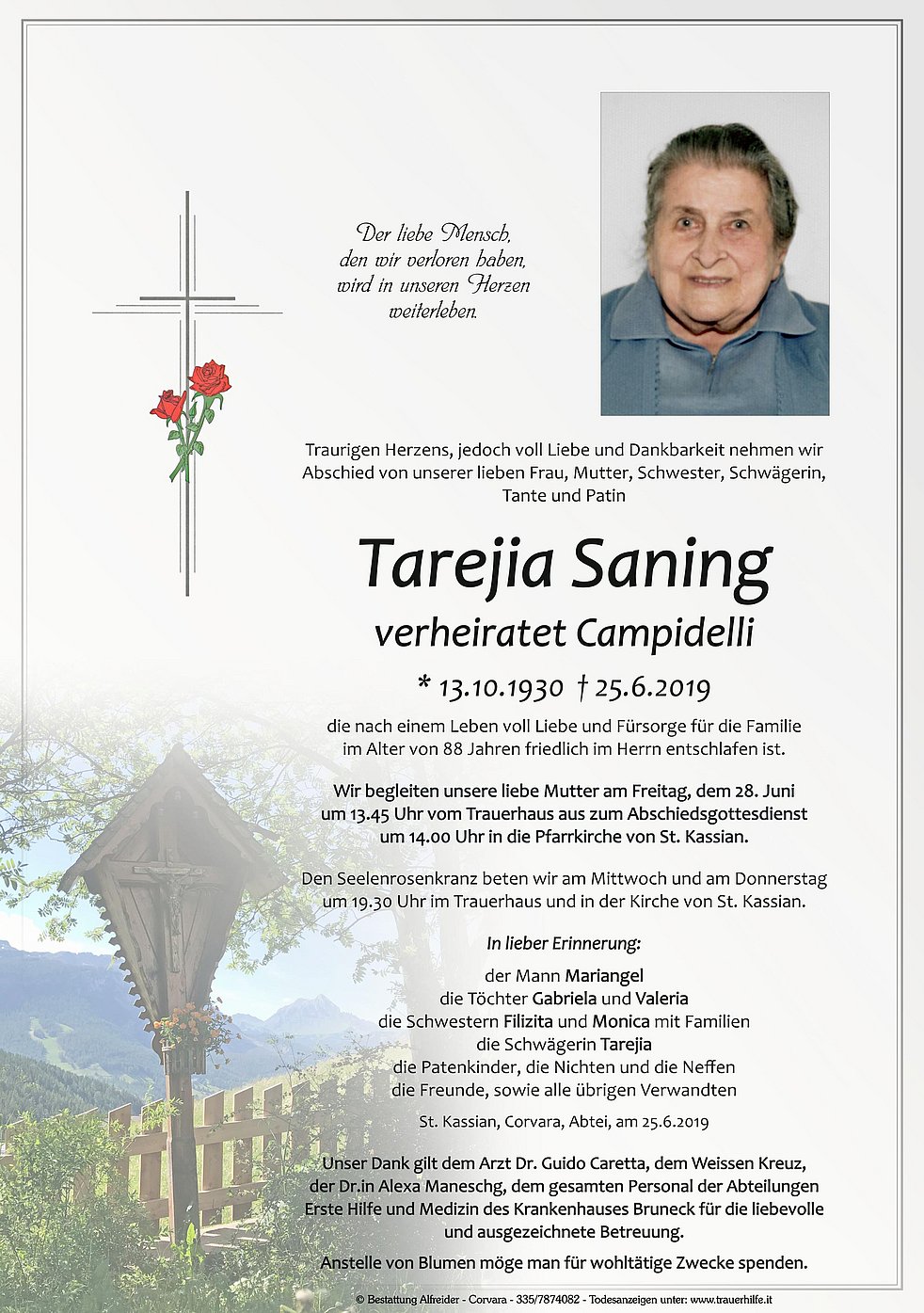 Wir begleiten unsere liebe Mutter am Freitag, dem 28. Juni um 13.45 Uhr vom Trauerhaus aus zum Abschiedsgottesdienst um 14.00 Uhr in die Pfarrkirche von St. Kassian.