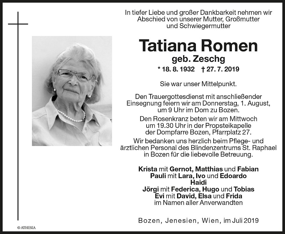 Wir bedanken uns herzlich beim Pflege- und ärztlichen Personal des Blindenzentrums St. Raphael in Bozen für die liebevolle Betreuung.