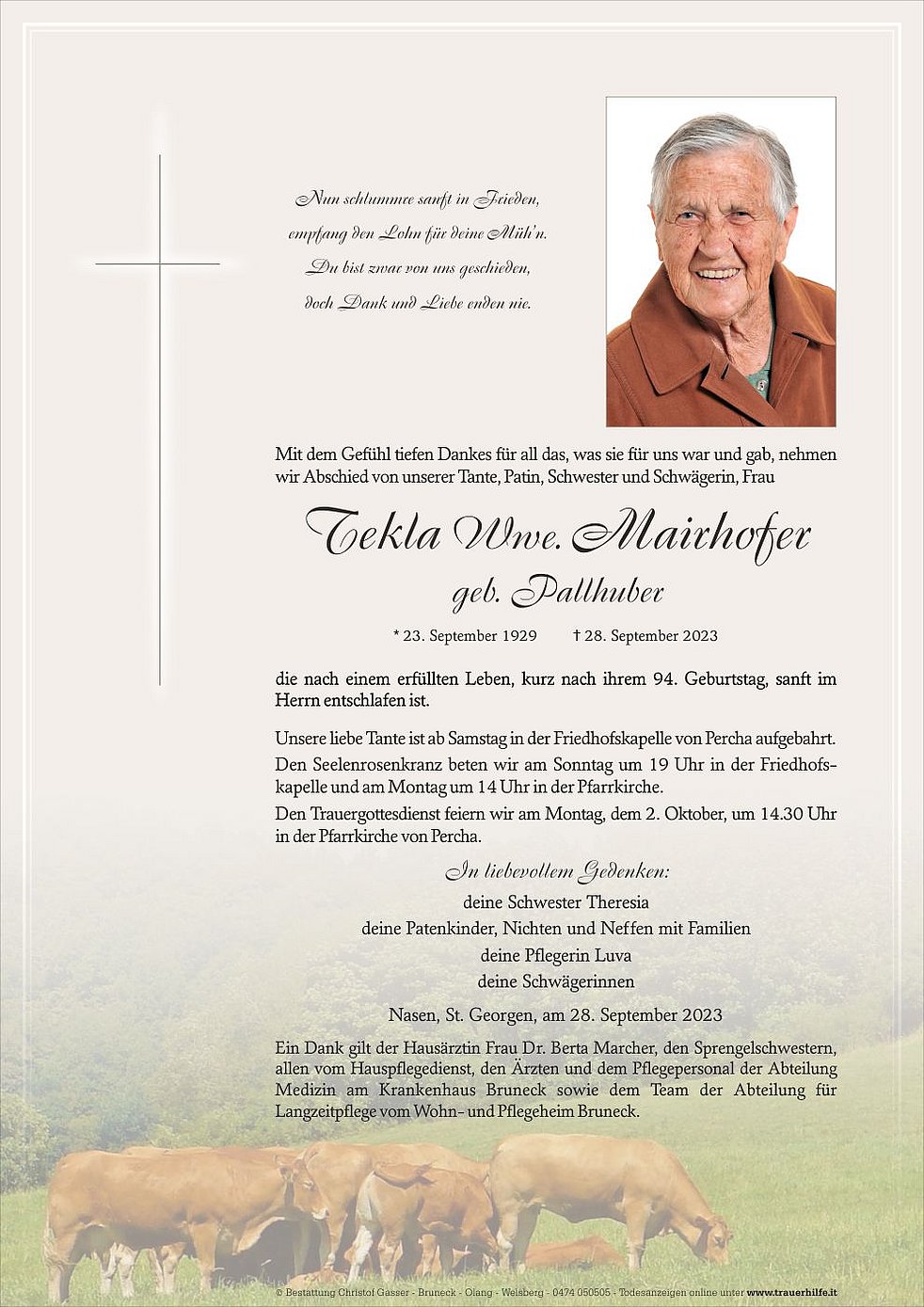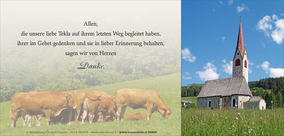 Ein Dank gilt der Hausärztin Frau Dr. Berta Marcher, den Sprengelschwestern, allen vom Hauspflegedienst, den Ärzten und dem Pflegepersonal der Abteilung Medizin am Krankenhaus Bruneck sowie dem Team der Abteilung für Langzeitpflege vom Wohn- und Pflegeheim Bruneck.