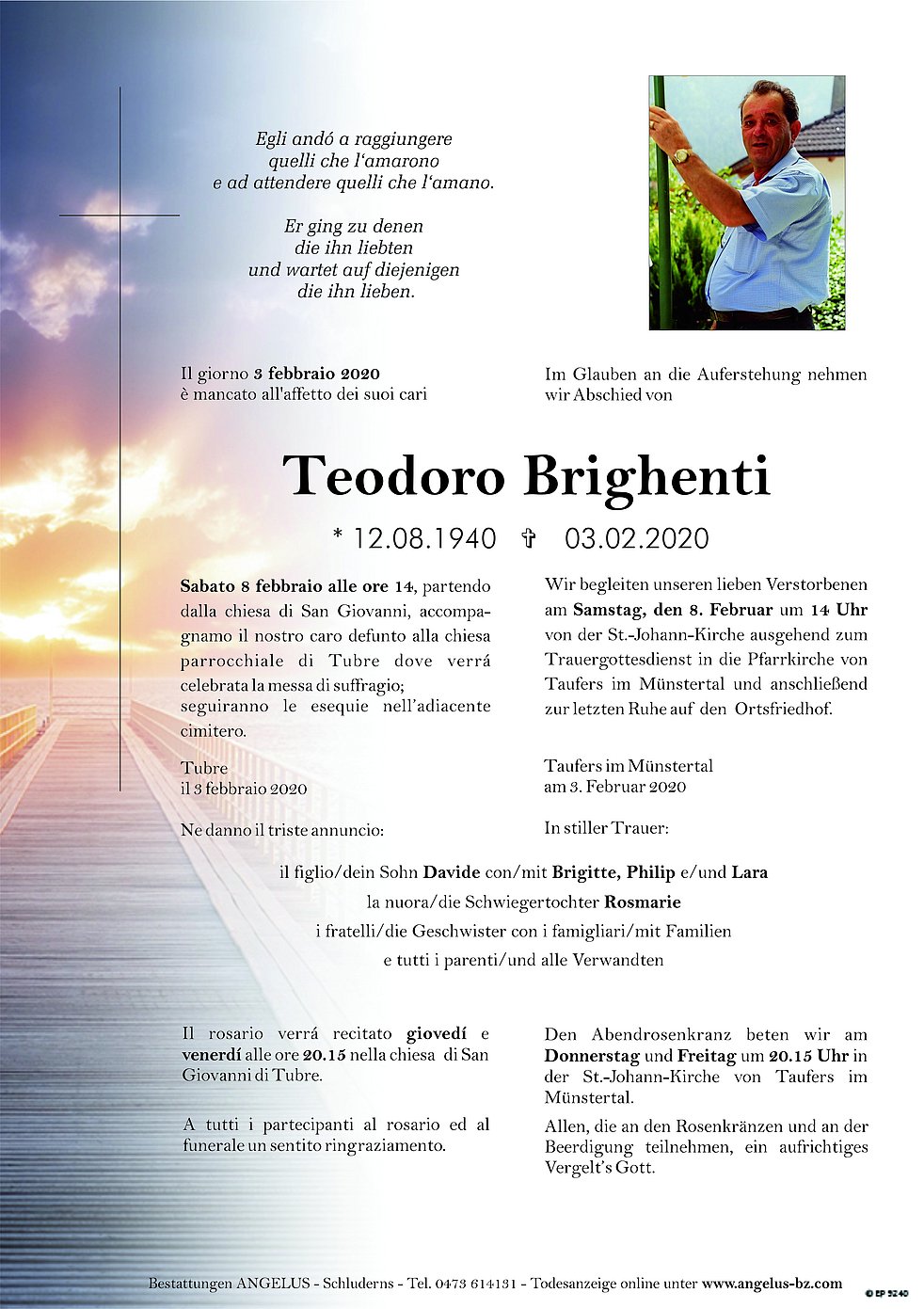 Wir begleiten unseren lieben Verstorbenen am Samstag, dem 8. Februar um 14 Uhr von der St.-Johann-Kirche ausgehend zum Trauergottesdienst in die Pfarrkirche von Taufers im Münstertal und anschließend zur letzten Ruhe auf den Ortsfriedhof.