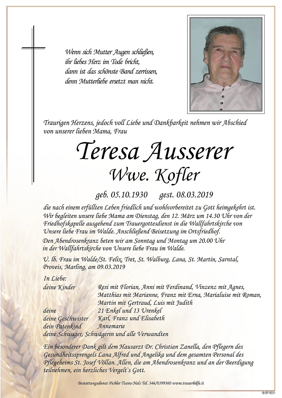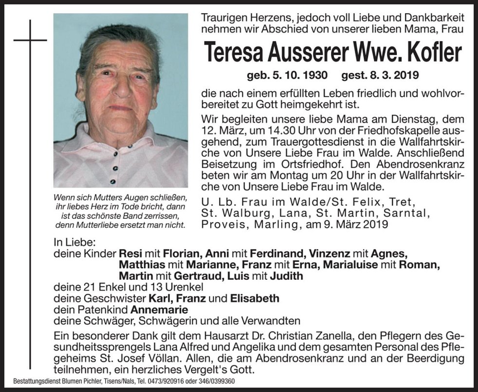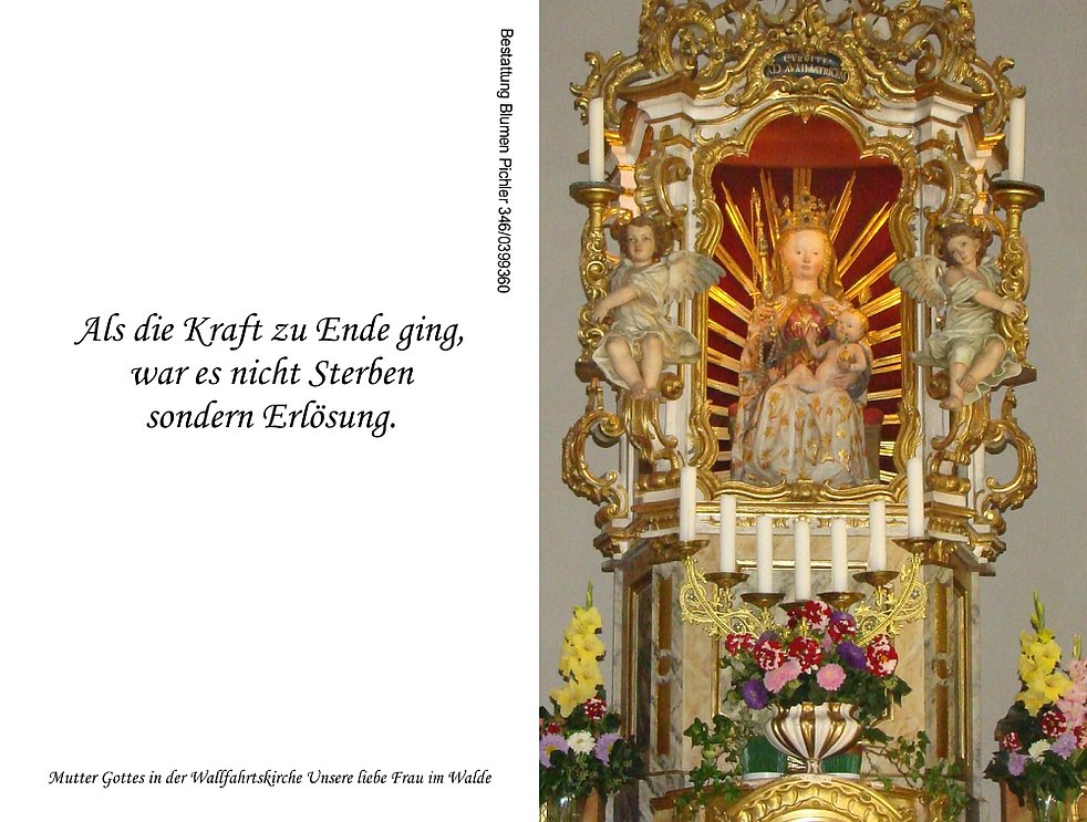 Begräbnisgottesdienst: 12.03. - 14:30 Uhr Unsere liebe Frau im Walde