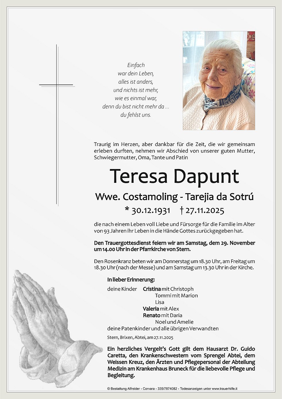 Trauerfeier: 29.11. - 14:00 Uhr Pfarrkirche Stern