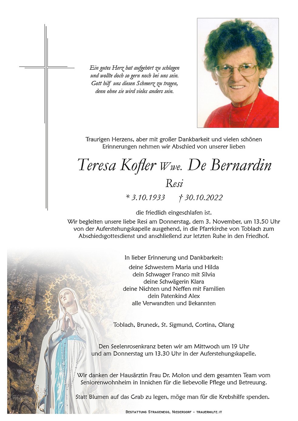 Wir begleiten unsere liebe Resi am Donnerstag, dem 3. November, um 13.50 Uhr von der Auferstehungskapelle ausgehend, in die Pfarrkirche von Toblach zum Abschiedsgottesdienst und anschließend zur letzten Ruhe in den Friedhof.