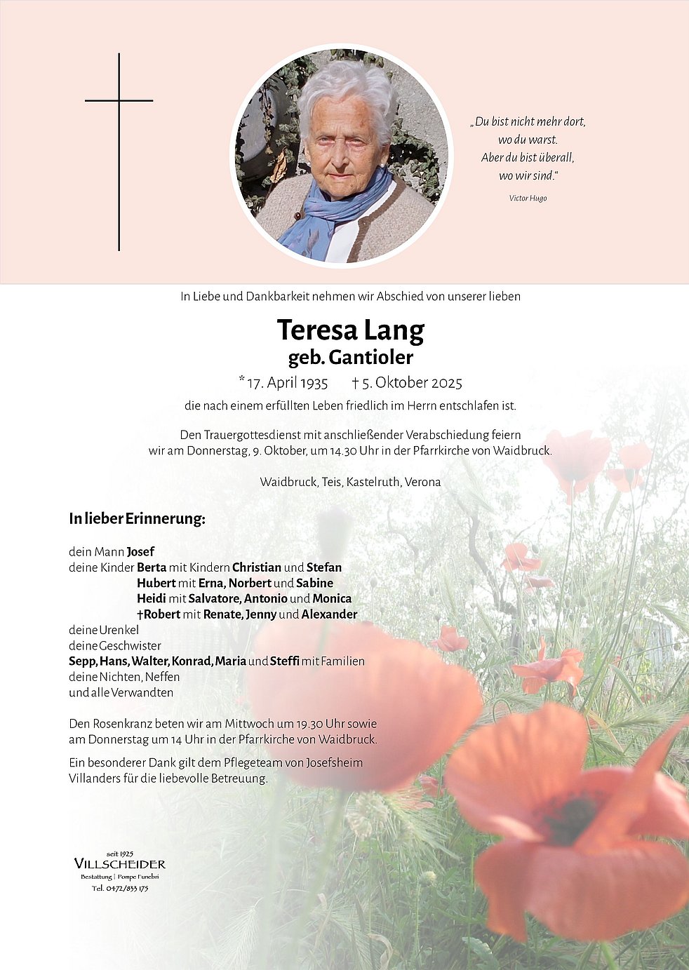 Trauerfeier: 09.10. - 14:30 Uhr Waidbruck