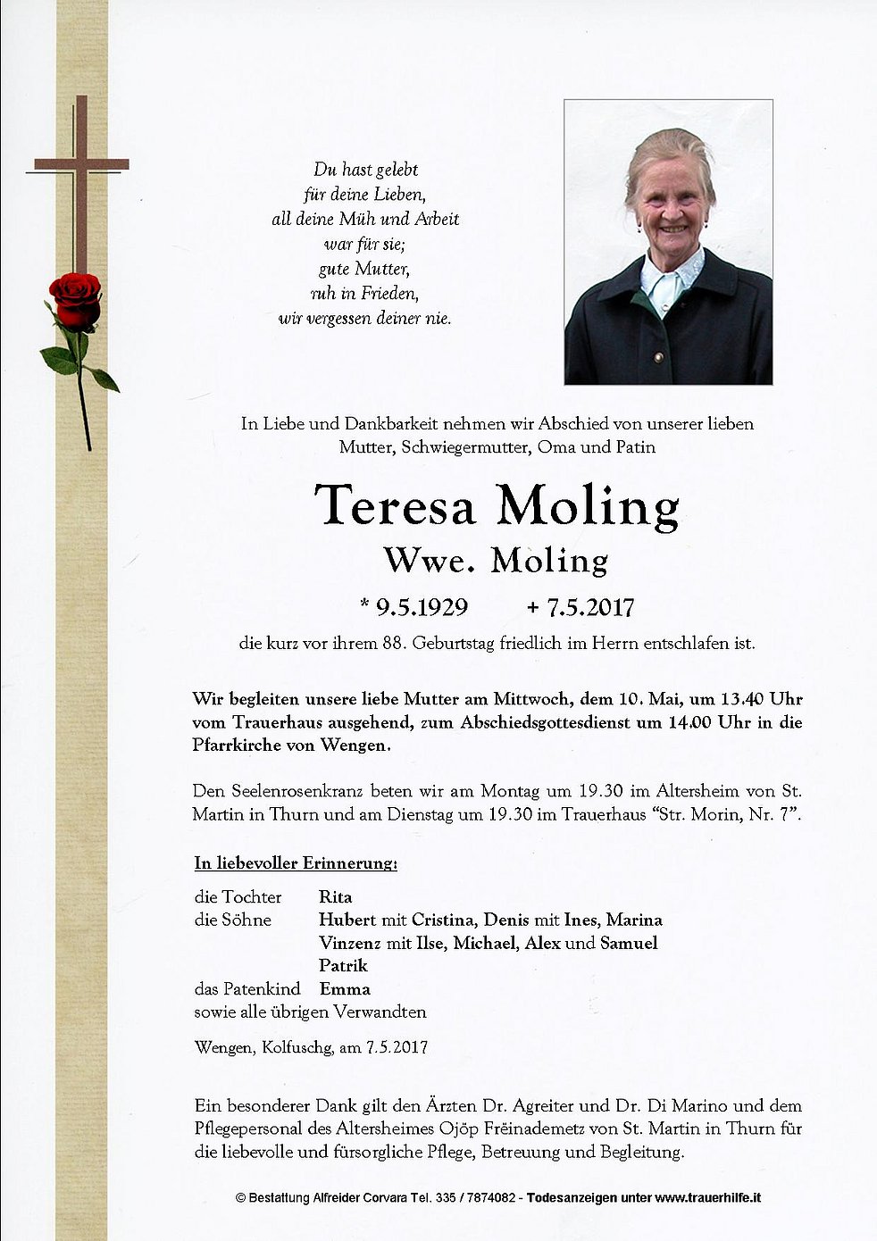 Wir begleiten unsere liebe Mutter am Mittwoch, dem 10. Mai, um 13.40 Uhr vom Trauerhaus ausgehend, zum Abschiedsgottesdienst um 14.00 Uhr in die Pfarrkirche von Wengen.