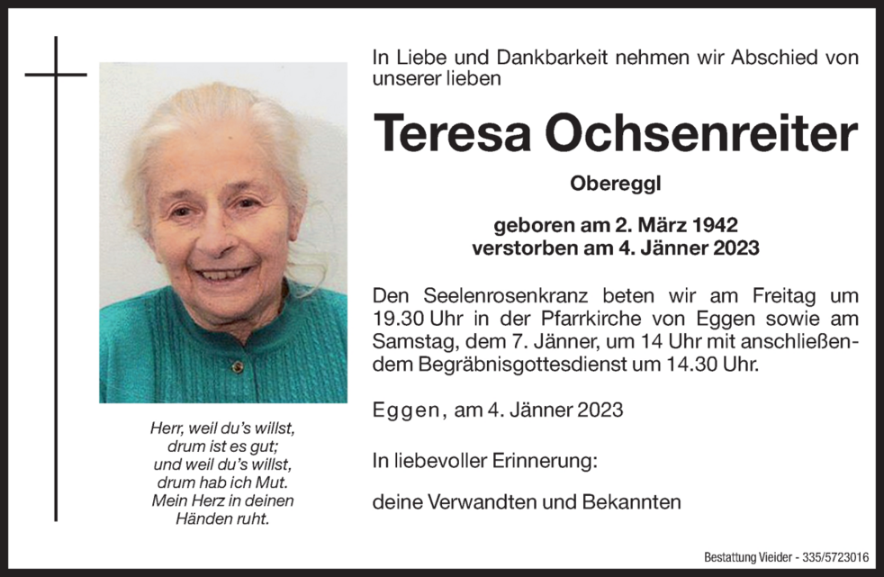 Den Seelenrosenkranz beten wir am Freitag um 19.30 Uhr in der Pfarrkirche von Eggen sowie am Samstag den 7. Jänner, um 14 Uhr mit anschließendem Begräbnisgottesdienst um 14.30 Uhr.