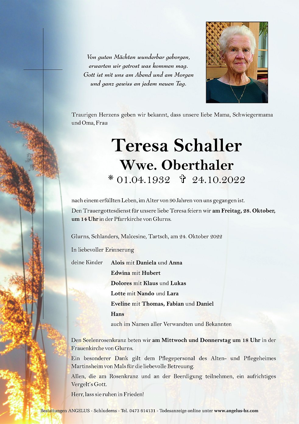 Liebe Dolores Edwina und Trauerfamilie Es ist schwer wenn sich's Mutter's Augen schließen,die nun ruhn aber einst so viel geschafft,still und leise Eure Tränen fließen, ein geliebtes Mutterherz wird zur letzten Ruh gebracht. Mein herzliches Beileid zum Tode eurer geliebten Mutter,Schwiegermutter und Oma. SILVIA TELSER