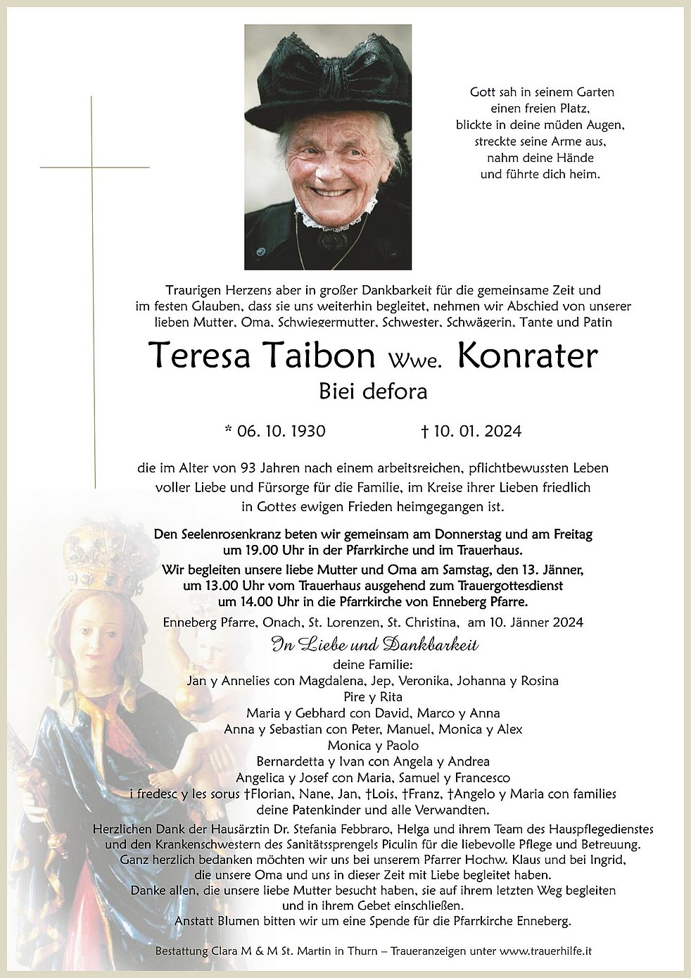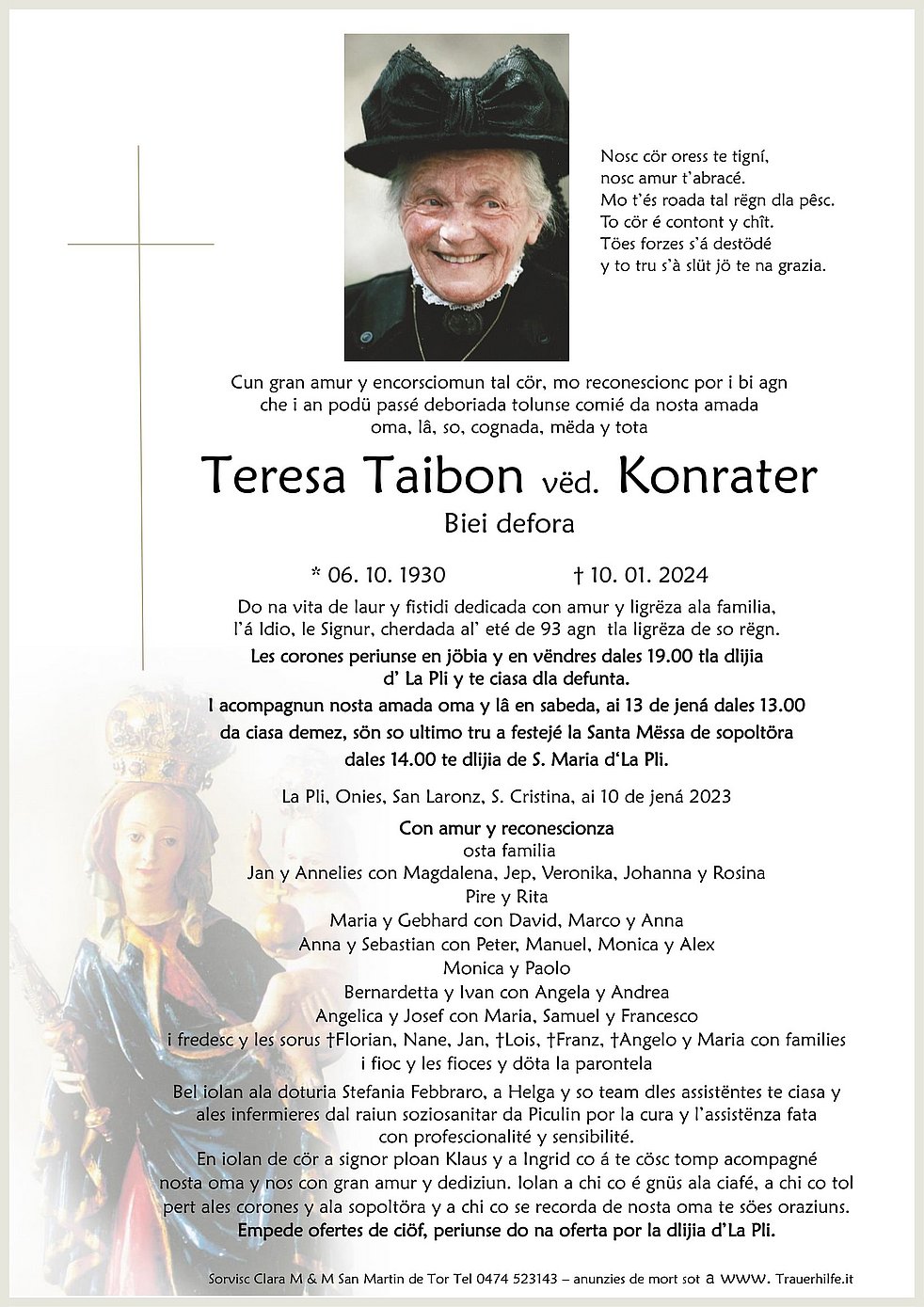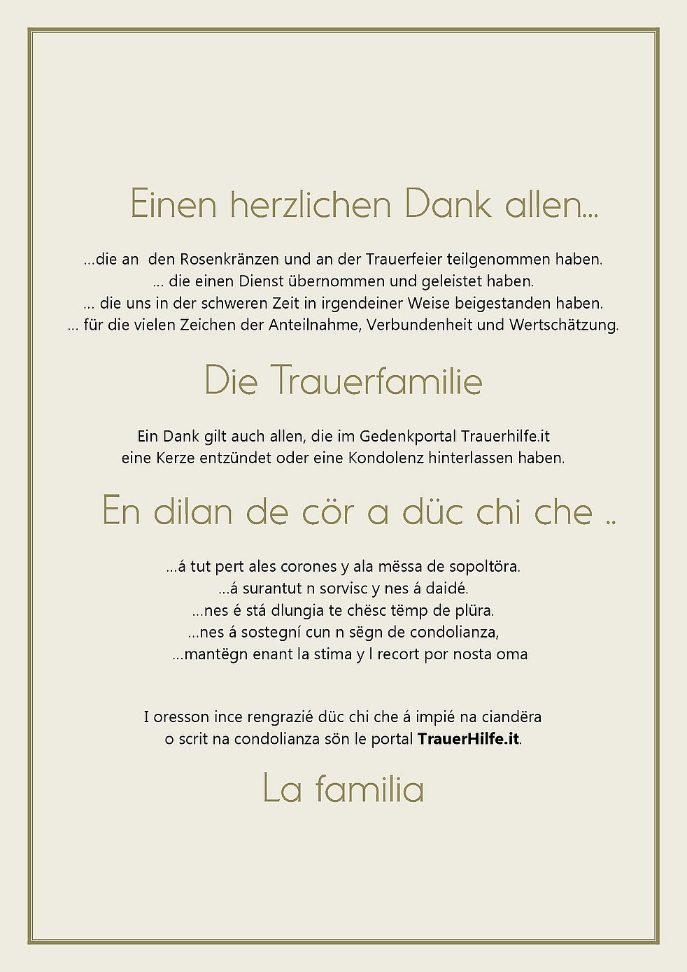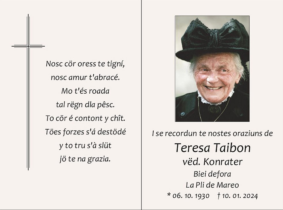 der bel él sté a Te avei tan dio danter nos y de cösc orunse ringrazié. Empo Te lajunse jí der eniert, mo te nosc cör aranse dagnora vis i bi recorc de Te. Jep, i fredesc, i geniturs....ai Te aspeta con ligreza. Tla vita áste lauré, fistidié, daidé, perié. Palsa sen saurí tla pesc de Dio y che El Te dái le paiamont ben merité por döt ci che Te as fat de bun bel tal chit sön chösc monn.