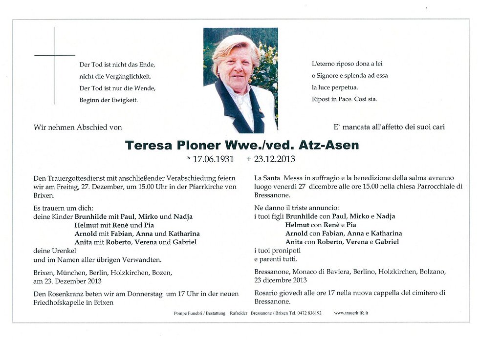 Gedankt sei dem Hausarzt Dr. Braun, dem Pflegepersonal des Gesundheitssprengel Klausen und dem Pflegepersonal des Altersheims Ojöp Freinademetz in St. Martin in Thurn für die liebevolle Betreuung sowie allen, die am Rosenkranz und an der Verabschiedung teilnehmen.