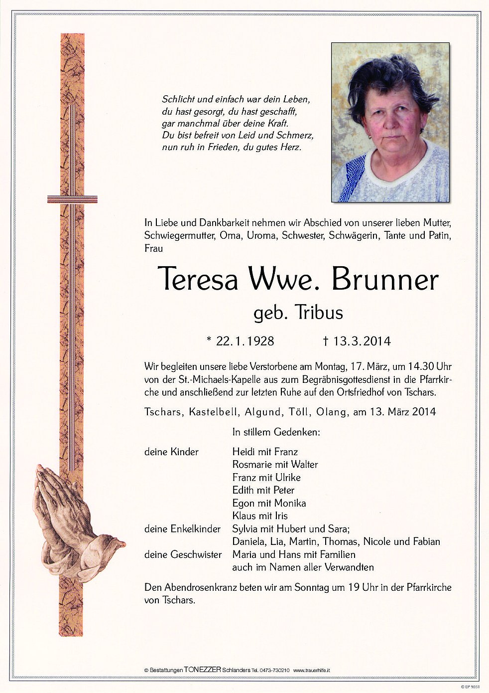Wir begleiten unsere liebe Verstorbene am Montag, 17. März, um 14.30 Uhr von der St.-Michaels-Kapelle aus zum Begräbnisgottesdienst in die Pfarrkirche und anschließend zur letzten Ruhe auf den Ortsfriedhof von Tschars.