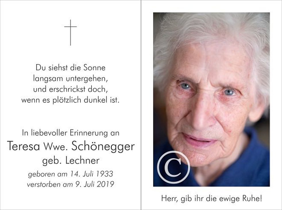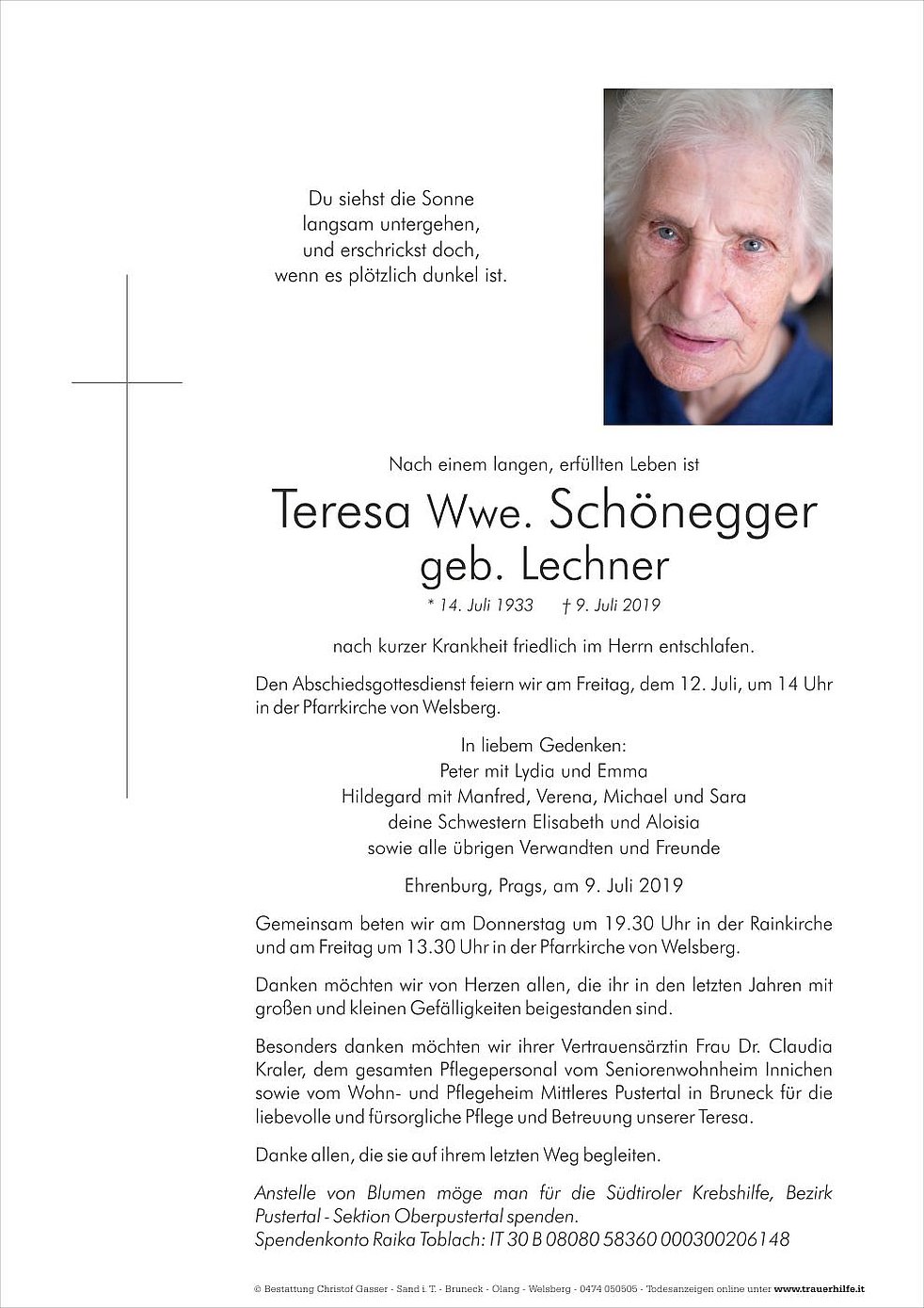 Besonders danken möchten wir ihrer Vertrauensärztin Frau Dr. Claudia Kraler, dem gesamten Pflegepersonal vom Seniorenwohnheim Innichen sowie vom Wohn- und Pflegeheim Mittleres Pustertal in Bruneck für die liebevolle und fürsorgliche Pflege und Betreuung unserer Teresa.