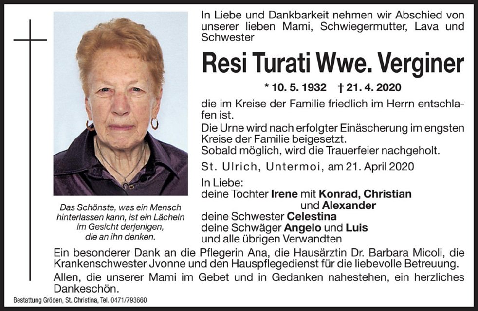 Ein besonderer Dank an die Pflegerin Ana, den Hausarzt Dr. Barbara Micoli, der Krankenschwester Jvonne und dem Hauspflegedienst für die liebevolle Betreuung.