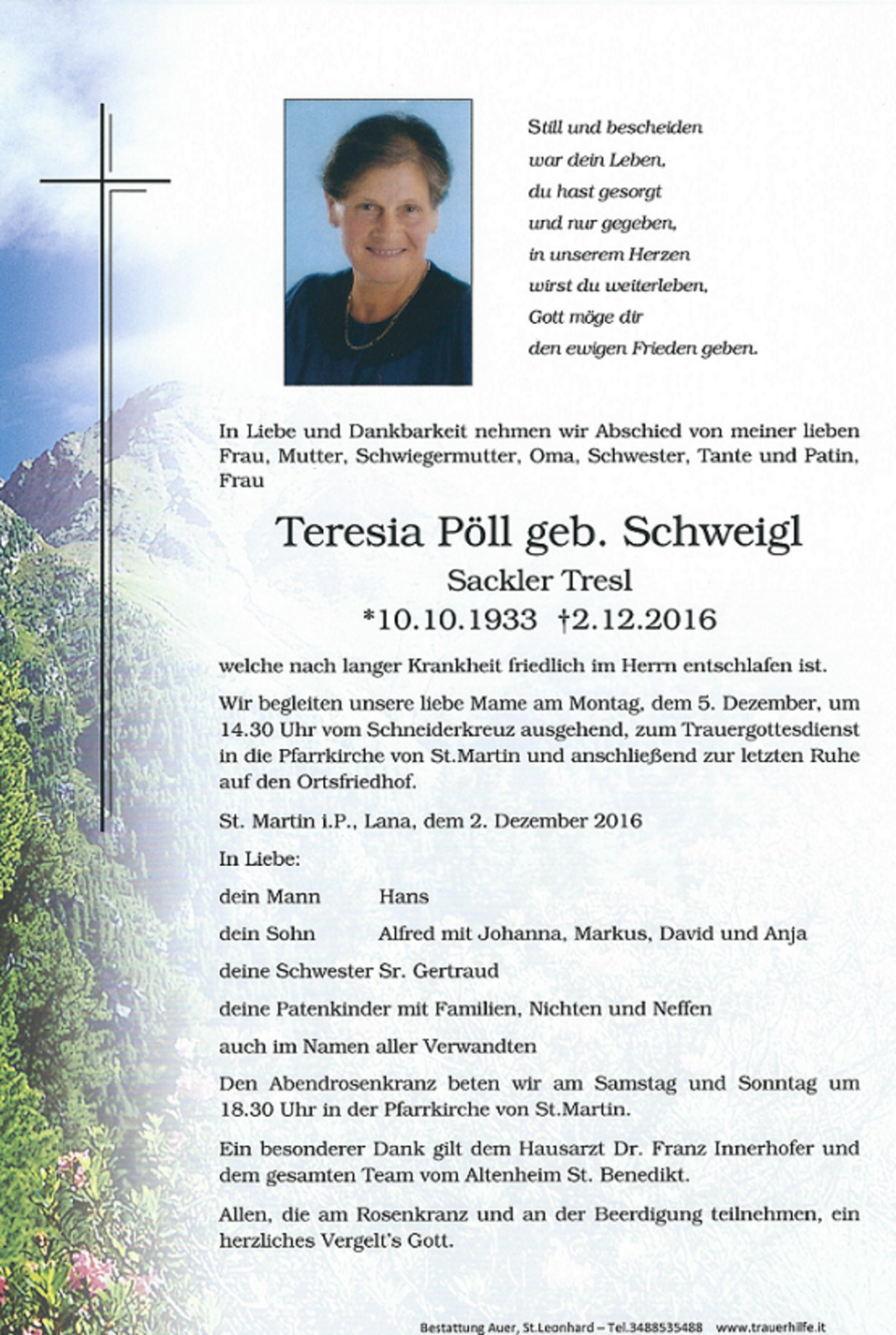 Ein besonderer Dank gilt dem Hausarzt Dr. Franz Innerhofer und dem gesamten Team vom Altenheim St. Benedikt.