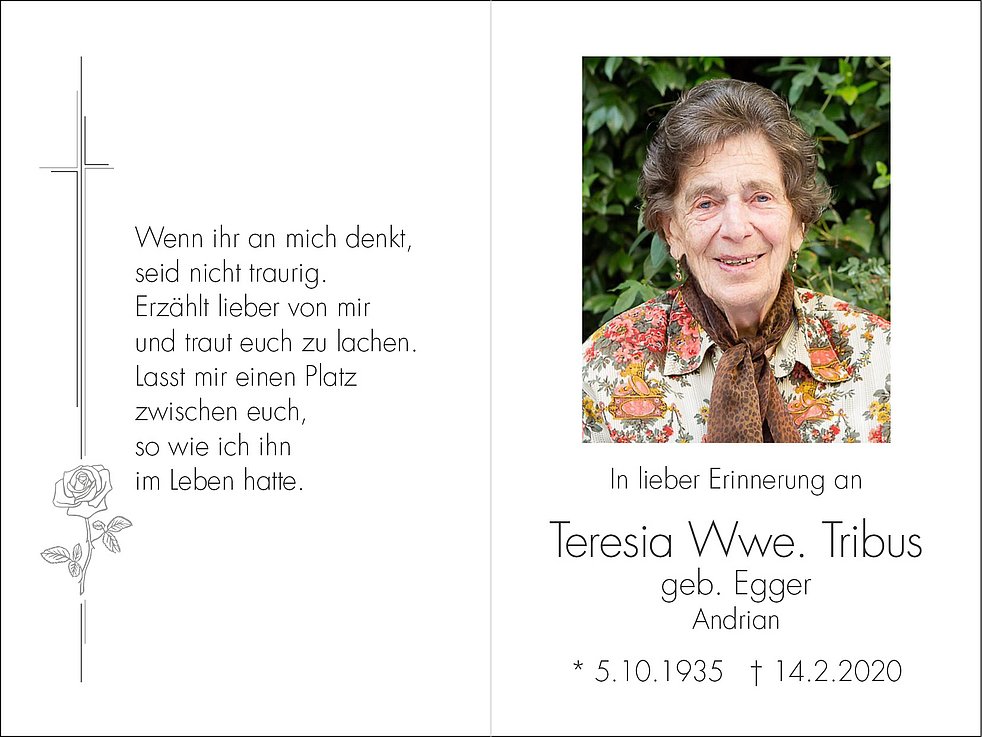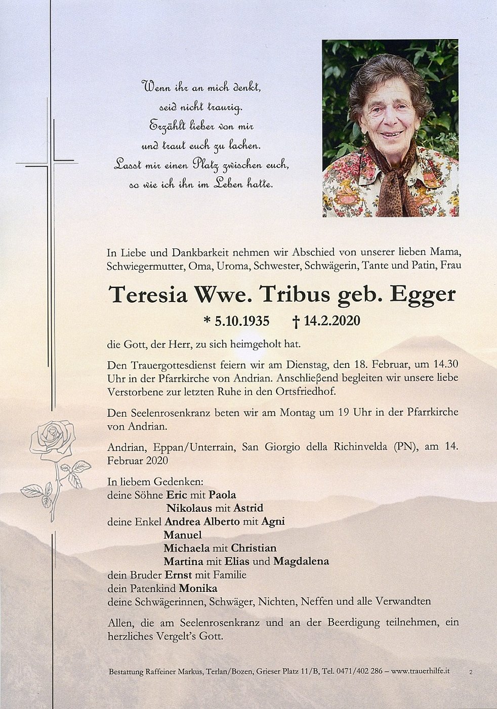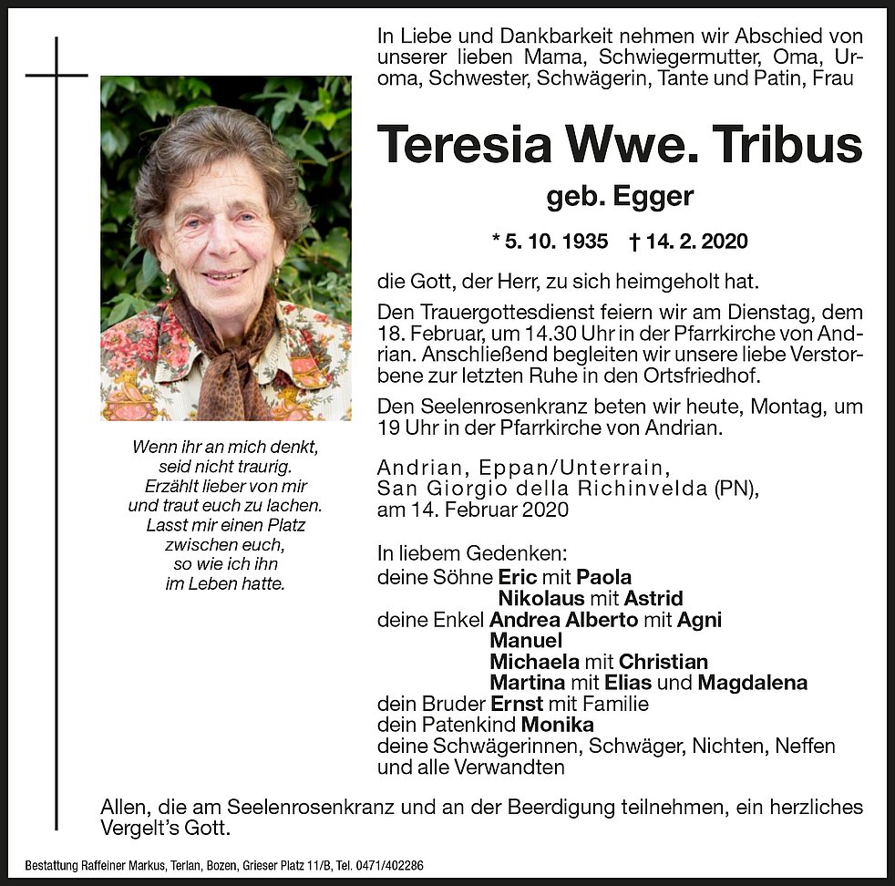Den Trauergottesdienst feiern wir am Dienstag, den 18. Februar, um 14.30 Uhr in der Pfarrkirche von Andrian. Anschlieβend begleiten wir unsere liebe Verstorbene zur letzten Ruhe in den Ortsfriedhof.