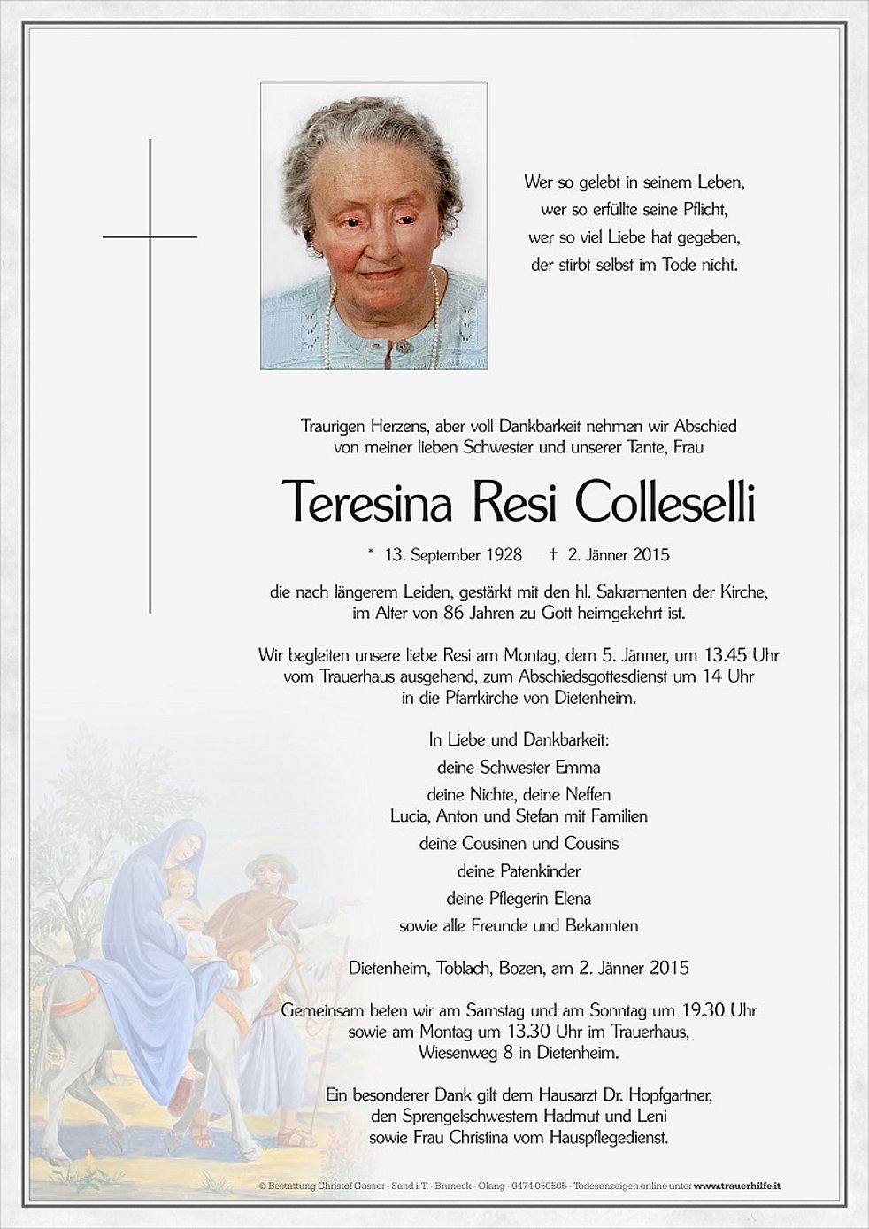 Wir begleiten unsere liebe Resi am Montag, dem 5. Jänner, um 13.45 Uhr vom Trauerhaus ausgehend, zum Abschiedsgottesdienst um 14 Uhr