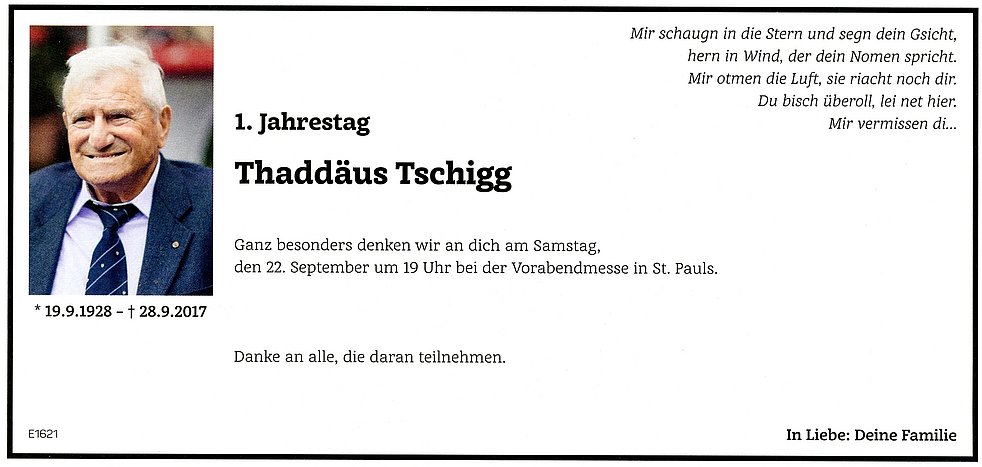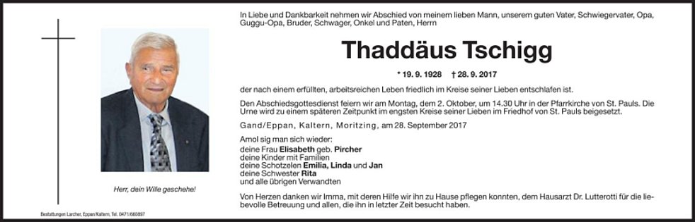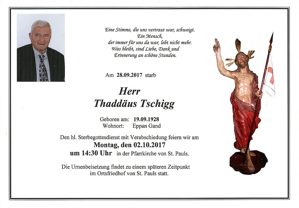 Den Abschiedsgottesdienst feiern wir am Montag, dem 2. Oktober um 14.30 Uhr in der Pfarrkirche von St. Pauls. Die Urne wird zu einem späteren Zeitpunkt im engsten Kreise seiner Lieben im Friedhof von St. Pauls beigesetzt.