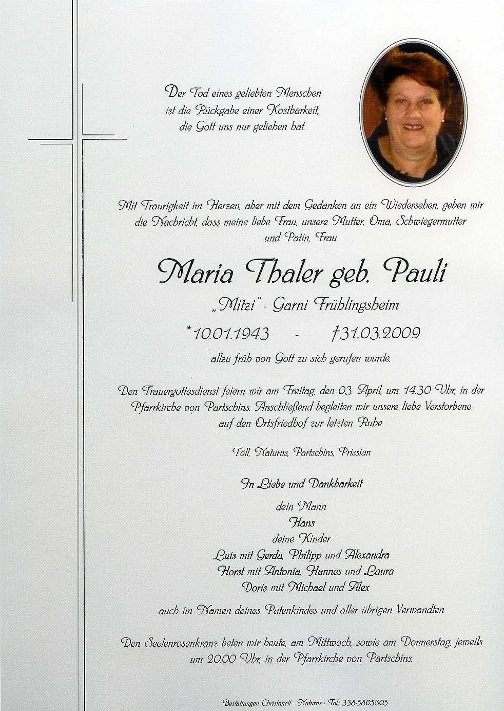 Den Trauergottesdienst feiern wir am Freitag, den 03. April, um 14.30 Uhr, in der Pfarrkirche von Partschins. Anschließend begleiten wir unsere liebe Verstorbene auf den Ortsfriedhof zur letzten Ruhe.