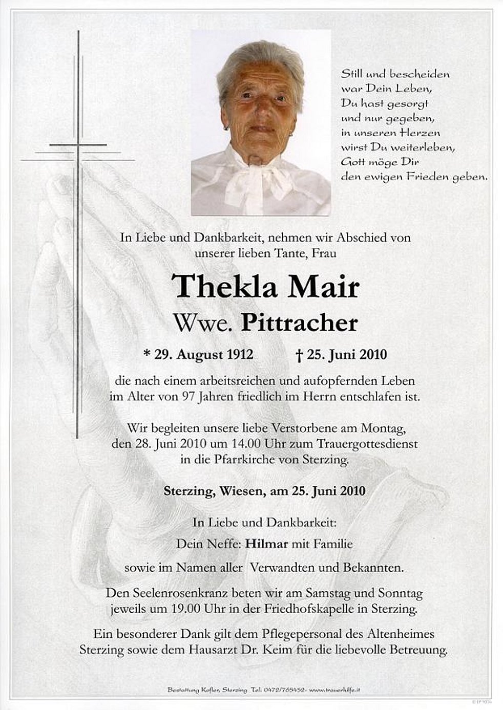 um 14.00 Uhr zum Trauergottesdienst in die Pfarrkirche von Sterzing.