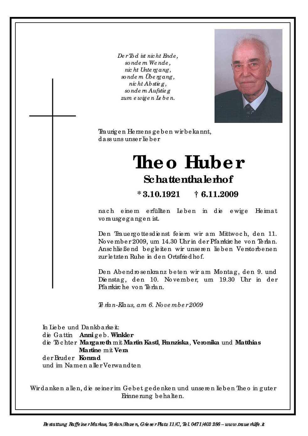 Den Trauergottesdienst feiern wir am Mittwoch, den 11. November 2009, um 14.30 Uhr in der Pfarrkirche von Terlan. Anschließend begleiten wir unseren lieben Verstorbenen zur letzten Ruhe in den Ortsfriedhof.
