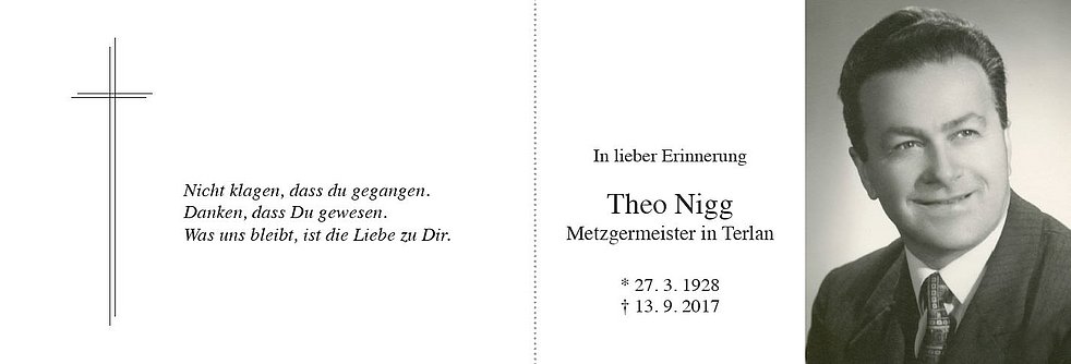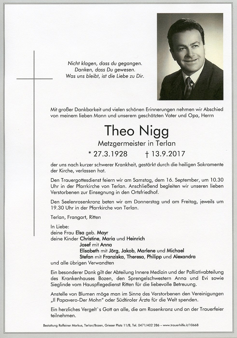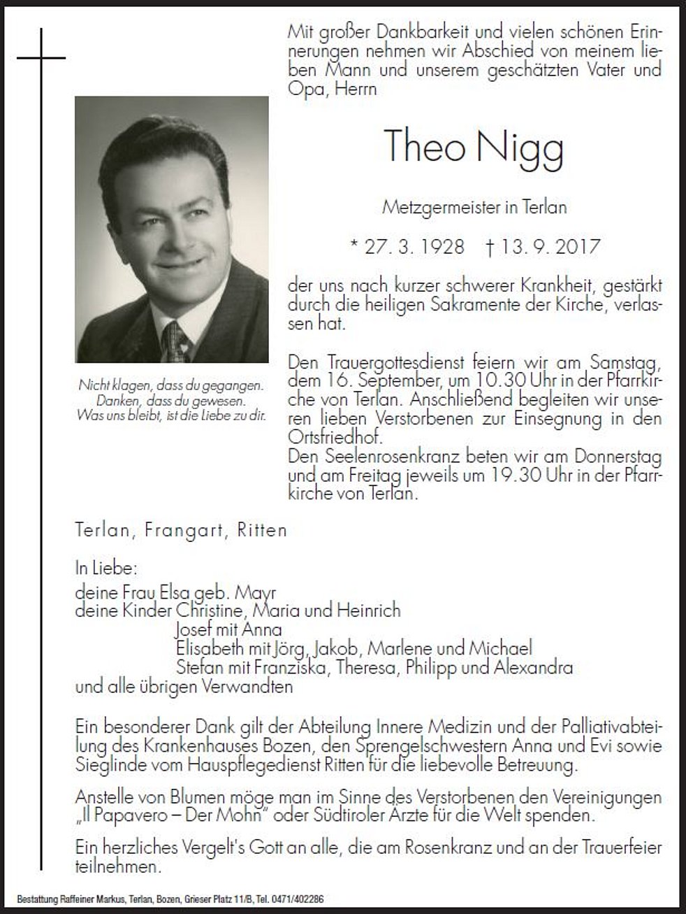 Den Trauergottesdienst feiern wir am Samstag, dem 16. September, um 10.30 Uhr in der Pfarrkirche von Terlan. Anschließend begleiten wir unseren lieben Verstorbenen zur Einsegnung in den Ortsfriedhof.