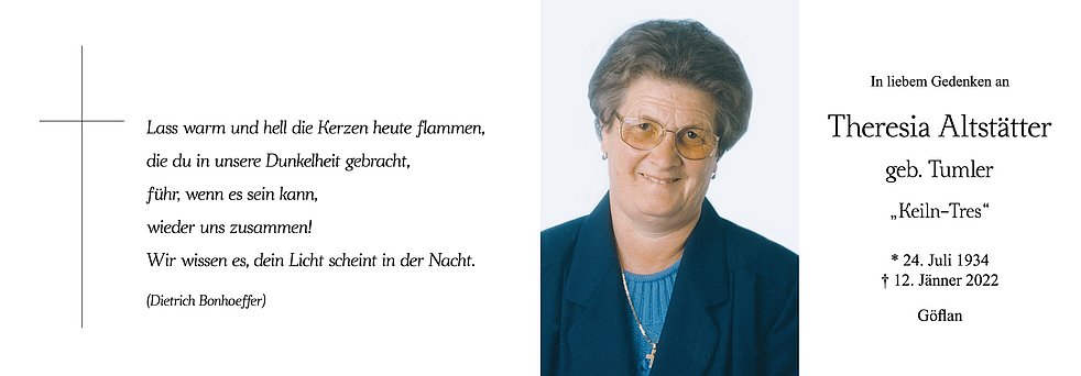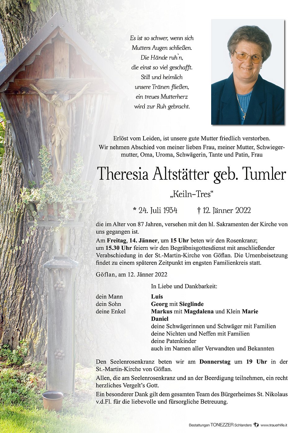 Am Freitag, 14. Jänner, um 15 Uhr beten wir den Rosenkranz; um 15.30 Uhr feiern wir den Begräbnisgottesdienst mit anschließender Verabschiedung in der St.-Martin-Kirche von Göflan.