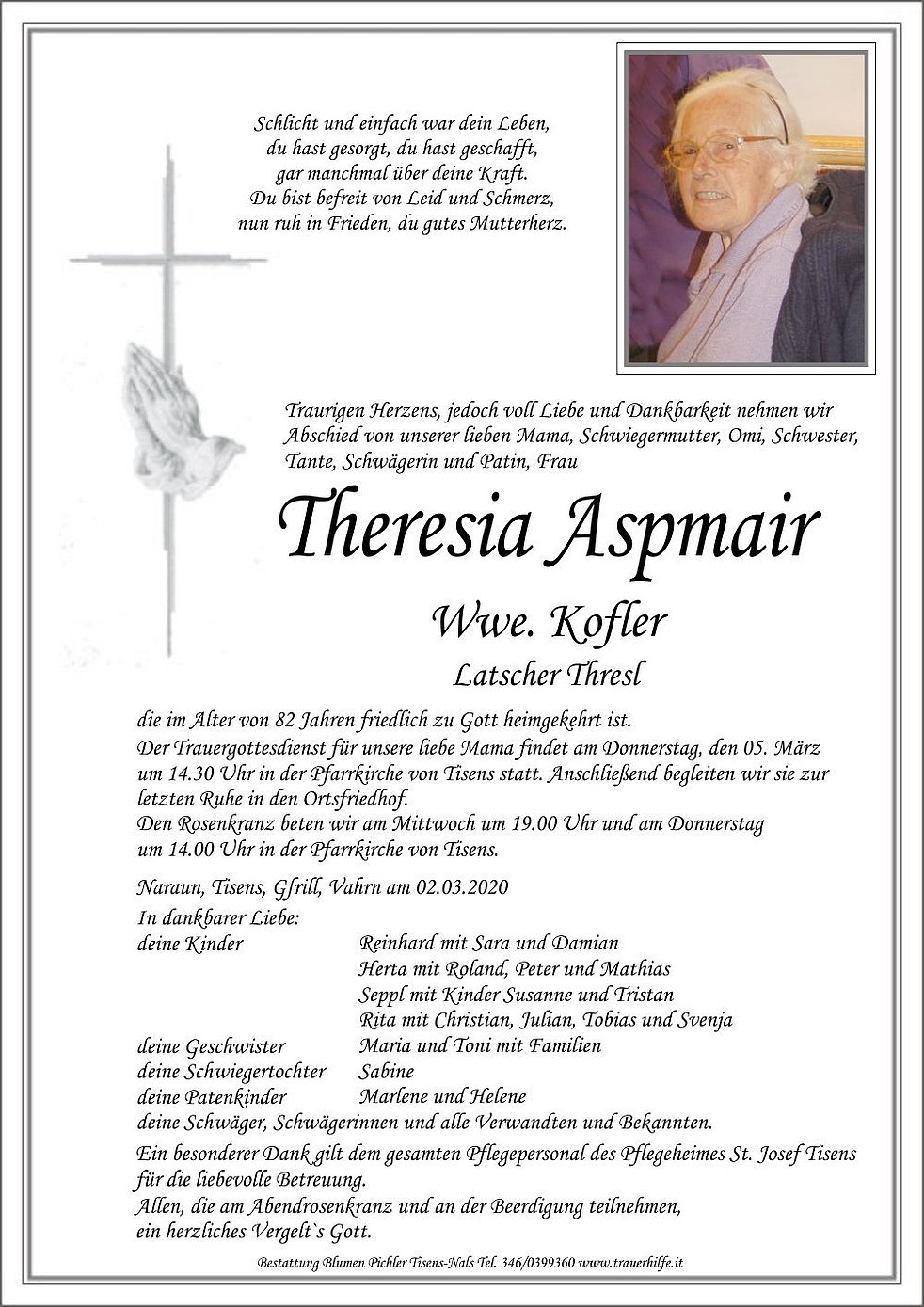 Der Trauergottesdienst für unsere liebe Mama findet am Donnerstag, den 05. März