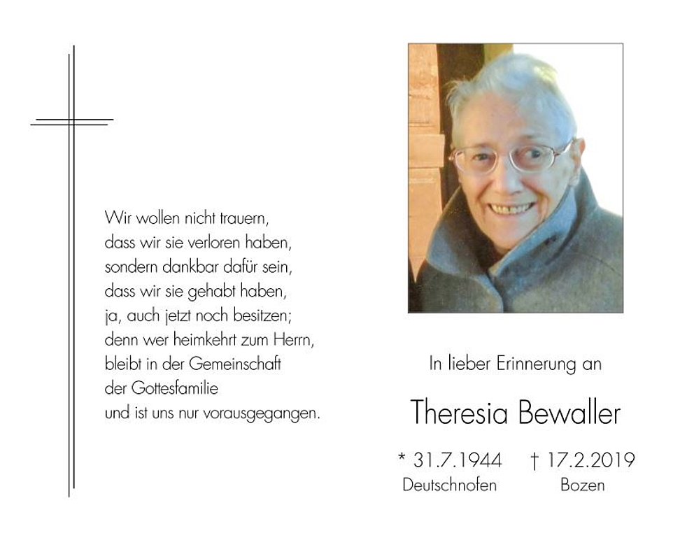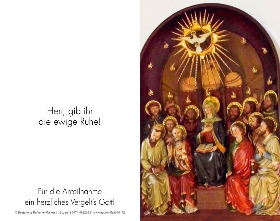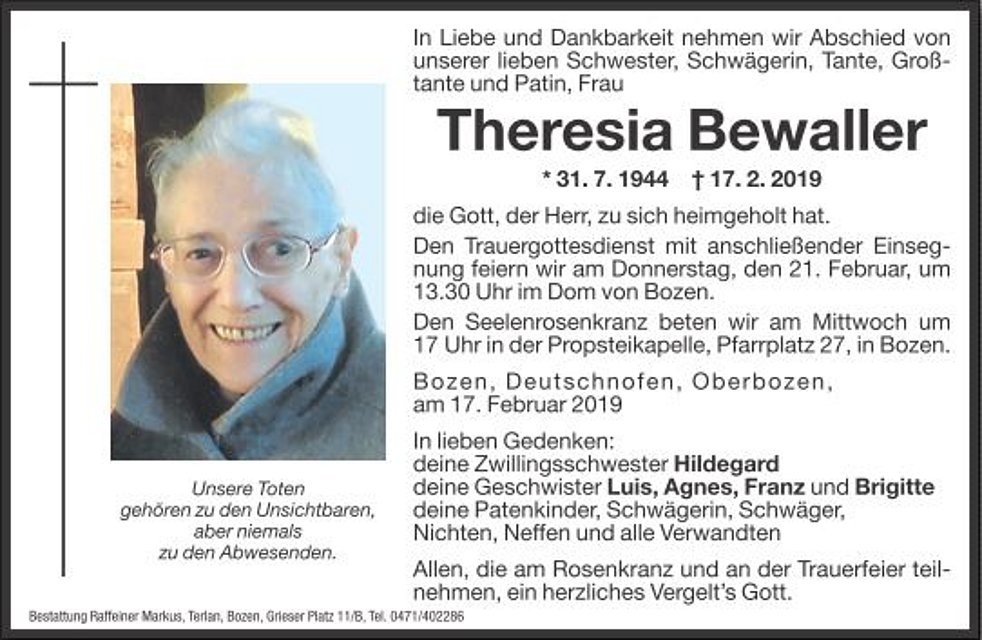 Den Trauergottesdienst mit anschlieβender Einsegnung feiern wir am Donnerstag, dem 21. Februar, um 13.30 Uhr im Dom von Bozen.