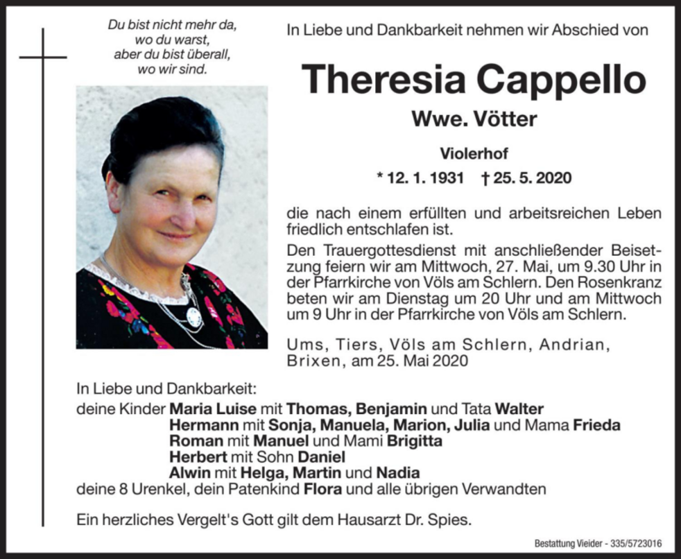 Den Trauergottesdienst mit anschließender Beisetzung feiern wir am Mittwoch, 27. Mai, um 09.30 Uhr in der Pfarrkirche von Völs am Schlern.