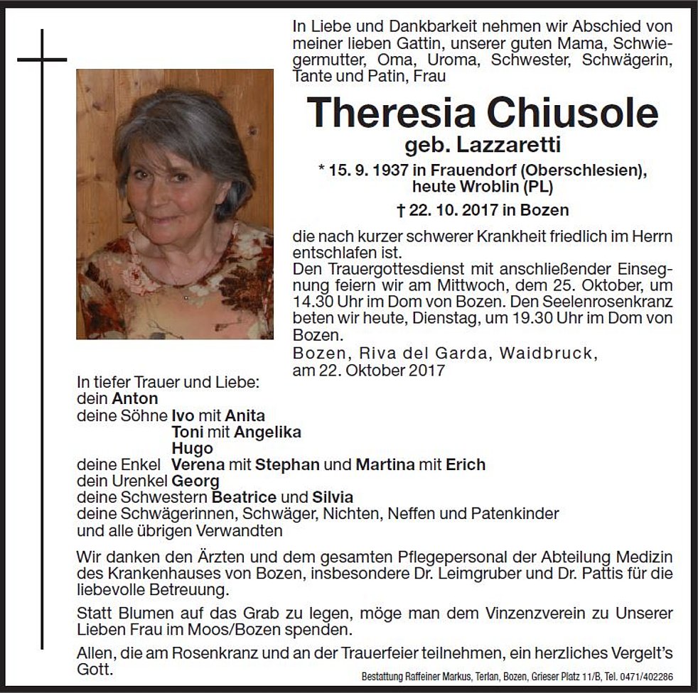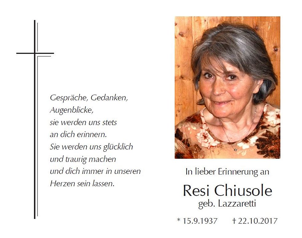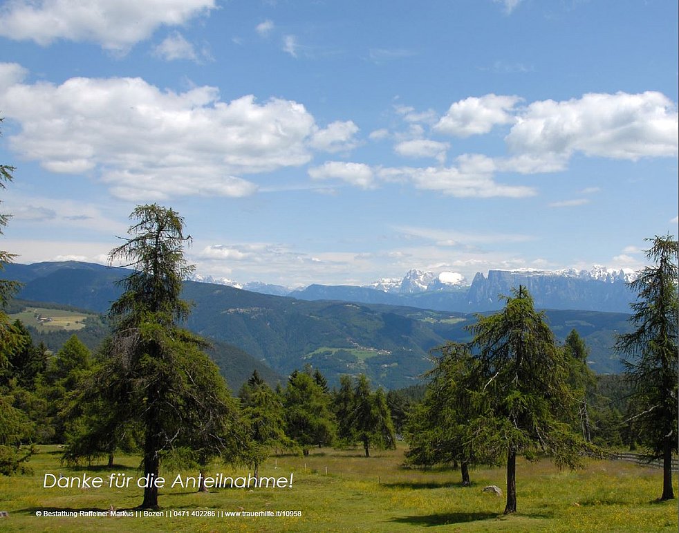 Anstatt Blumen auf das Grab zu legen, möge man dem Vinzenzverein-Bozen-Unsere liebe Frau von Moos spenden.