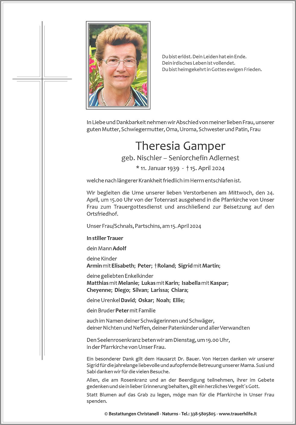 Wir begleiten die Urne unserer lieben Verstorbenen am Mittwoch, den 24. April, um 15.00 Uhr von der Totenrast ausgehend in die Pfarrkirche von Unser Frau zum Trauergottesdienst und anschließend zur Beisetzung auf den Ortsfriedhof.