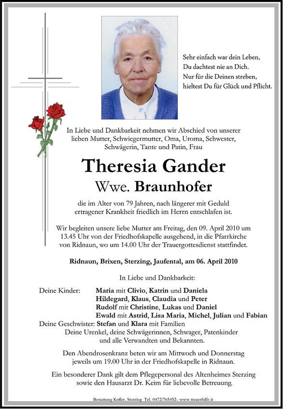 Wir begleiten unsere liebe Mutter am Freitag, den 09. April 2010 um 13.45 Uhr