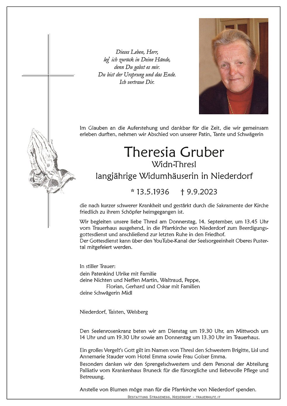 Begräbnisgottesdienst: 14.09. - 14:00 Uhr Niederdorf