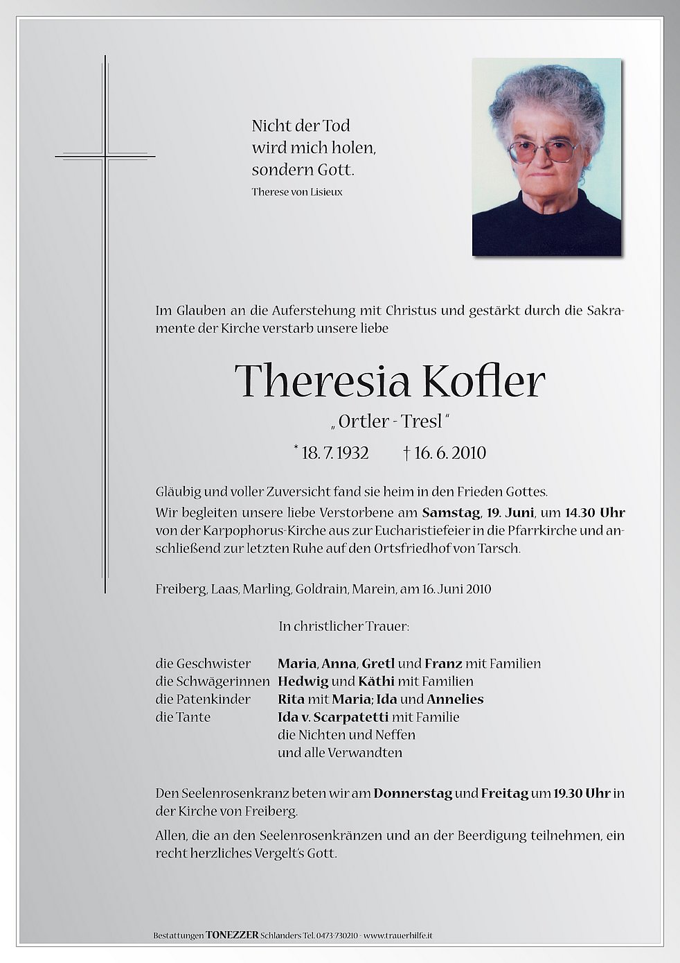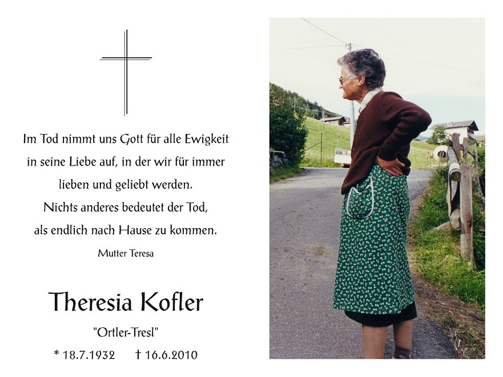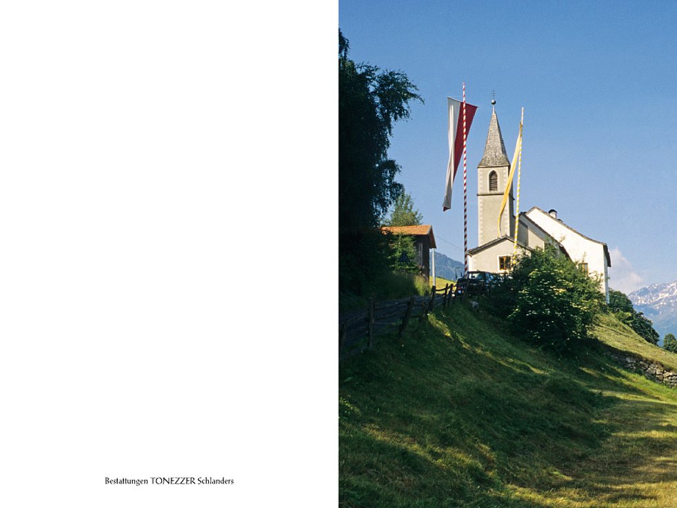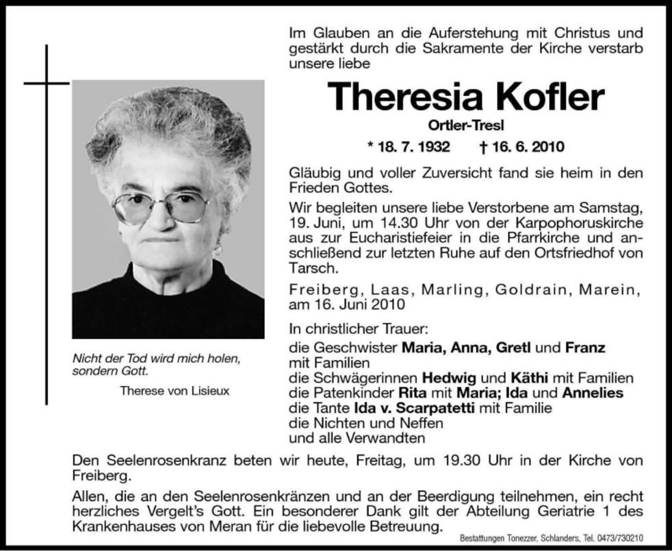 Wir begleiten unsere liebe Verstorbene am Samstag, 19. Juni, um 14.30 Uhr von der Karpophorus-Kirche aus zur Eucharistiefeier in die Pfarrkirche und anschließend zur letzten Ruhe auf den Ortsfriedhof von Tarsch.