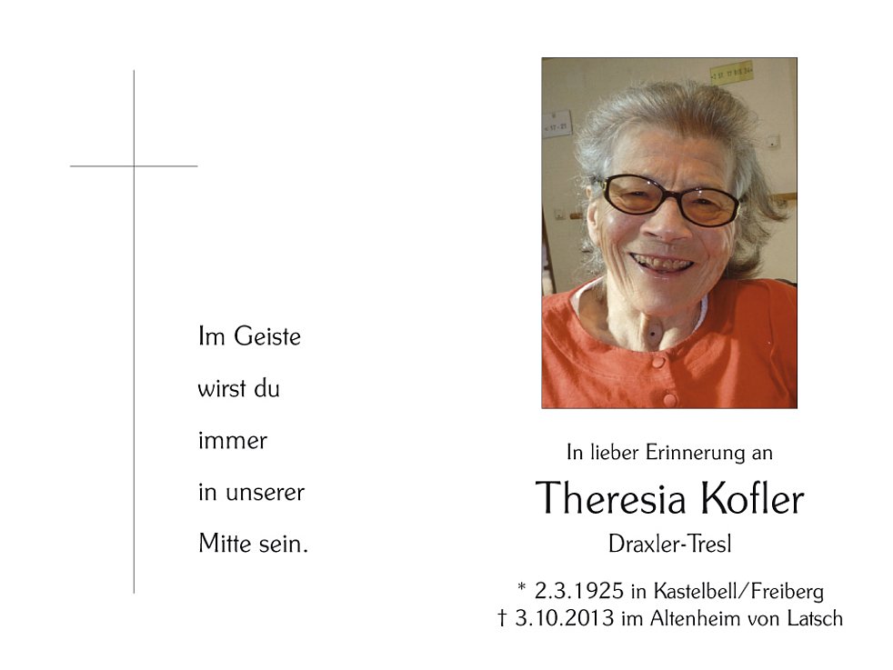 Am Samstag, 5. Oktober, um 14.30 Uhr feiern wir den Begräbnisgottesdienst in der Pfarrkirche, und anschließend begleiten wir unsere liebe Tresl zur letzten Ruhe auf den Ortsfriedhof von Kastelbell/Marein.